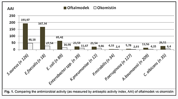 First, oftalmodek has high antimicrobial activity against a broad spectrum of infectious agents (S. aureus, E. faecalis, E. coli, Enterobacter spp., K. рneumoniae, A. baumannii, P. aeruginosa, P. mirabilis). This was evidenced by the respective indices of its activity, which were 1.8 to 6-fold higher than those of okomistin (р < 0.001).