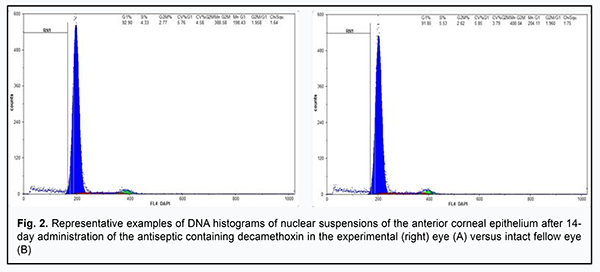 Our experimental study found no significant difference (p > 0.05) in fractions of ACE cells in various cell cycle phases and ACE DNA fragmentation between experimental eyes that received OD and intact fellow eyes, thus evidencing no proapoptotic, antiproliferative, or cytotoxic effects of decamethoxin. Experimental eyes in the okomistin group demonstrated depressed DNA synthesis in nuclei of ACE cells, with the fraction of ACE cells in the S phase that was 1.4-fold lower than in intact fellow eyes. In addition, the fraction of ACE cells in the G2+M phase and proliferative index of the ACE were 1.4-fold and 1.6-fold, respectively, lower (р < 0.05). Moreover, flow cytometry analysis of ACE cells showed that upon prolonged administration of OD, the DNA fragmentation level in epithelial cell nuclei was increased 1.5-fold (p<0.05), providing evidence of the proapoptotic effect of the antiseptic containing miramistin.