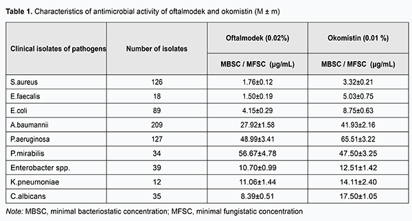 The antimicrobial efficacies of oftalmodek and okomistin  were examined using serial two-fold dilutions to determine minimal bacteriostatic concentrations (MBSC) of the drugs for clinical isolates of the following opportunistic pathogens that caused inflammatory and infectious processes in patients of Eye Microsurgery Department and patients with a severe surgical pathology treated at the Regional Clinical hospital of Vinnytsia: S. aureus (n=126), E. faecalis (n=18), E. coli (n=89), Enterobacter spp. (n=39), K. pneumoniae (n=12), A. baumannii (n=209), P. aeruginosa (n=127), P. mirabilis (n=34), and C. albicans (n=35) [7].