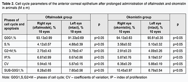Results:  When compared with OM, OD demonstrated a higher antimicrobial efficacy against a wide spectrum of infectious agents (р < 0.001). Our in vivo flow cytometry study found no significant difference (p > 0.05) in fractions of ACE cells in various cell cycle phases between experimental eyes that received OD and intact fellow eyes. Experimental eyes in the okomistin group demonstrated depressed DNA synthesis in nuclei of ACE cells, with the fraction of ACE cells in the S phase that was 1.4-fold lower (р < 0.05) than in intact fellow eyes. In addition, the fraction of ACE cells in the G2+M phase and proliferative index of the ACE were 1.4-fold and 1.6-fold, respectively, lower (р < 0.05),  whereas DNA fragmentation level in ACE cell nuclei was 1.5-fold higher (р < 0.05) than in intact fellow eyes.