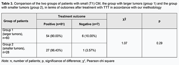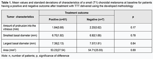 Introduction A small (T1) choroidal melanoma (CM) protruding 3.5-4.0 mm into the vitreous requires a special approach to the choice of treatment, since the neoplasm is in an early stage of its development, and there is a hope for better visual and survival prognosis [1-8]. Diode laser transpupillary thermotherapy (TTT) have been successfully utilized for treating CM since nineteen nineties [9-20], and allows to maintain visual function at a rather high level, while sparing healthy ocular tissues. TTT used as a monotherapy may be a treatment of choice for small choroidal melanomas. It is important that the procedure can be performed on an outpatient basis. We developed the methodology for performing TTT, which involves four sessions delivered daily over four consecutive days (Information Bulletin No. 22 based on Pat. of Ukraine №102,890 issued 25.11.2015. Method for treatment of T1 choroidal melanoma), and which we have been using for the treatment of small (T1) CM (measuring ≤ 3 mm in thickness and ≤ 12 mm in basal dimension) for 15 years. The purpose of the study was to investigate the efficacy of 810-nm diode laser transpupillary thermotherapy delivered using the developed methodology for CM differing in magnitude of baseline characteristics. Materials and Methods Eighty-eight patients (63 men (71.6%) and 25 women (28.4%); mean age, 55.9 (12.8) years (range, 23 to 82 years) with small (T1 according to the 2009 American Joint Committee on Cancer (AJCC)/ Union for International Cancer Control (UICC) staging system) CM (measuring ≤ 3 mm in thickness and ≤ 12 mm in basal dimension) treated at the Filatov Institute were involved into the study. The right eye was affected in 41 cases (46.6%), and the left eye was affected in the other 47 cases (53.4%). TTT was performed using a diode laser at 810nm (Iridis Quantel medical, France). The laser light was continuously delivered through one of the three lenses (the three-mirror Goldmann lens, Mainster PRP 165 or Mainster WF lens). The energy of the laser beam was gradually increased from 200 mW to 1800 mW to give the desired endpoint (either no color change or a subtle whitening of the tumor surfaces with no pain sensation) (Fig. 1). Laser spot size varied from 1.25 mm to 4 mm, depending on tumor basal dimension, proximity of functionally important structures (the macula and papillomacular bundle), and vessel location on the tumor surface. Overlapping treatment spots were applied from the periphery to the center to cover the entire tumor surface, including 1-2 mm of clinically normal tissue around the margin of the tumor. The exposure time was 60 seconds. Before each treatment session, the pupil was dilated with mydriatic drops, and one drop of topical alcaine 0.5% anesthetic was instilled into the conjunctival sac three times at interval of 2-3 minutes. After treatment sessions, a drop of non-steroidal anti-inflammatory drug (NSAID) was given five times daily over a week, whereas 1.0-ml parabulbar corticosteroid injection, oral NSAID and oral diuretic were administered daily for four days. The interval between follow-up visits was 2-3 months. If partial tumor regression was observed, the treatment course was repeated until complete scarring of the tumor site was observed. Each patient received between 2 to 9 TTT courses. The outcomes of treating small CM differing in baseline parameters (amount of protrusion into the vitreous; basal dimension (or diameter); and tumor area) using our methodology were subjected to analysis. Treatment outcome was categorized as positive if partial or complete scarring of the tumor site was observed by ophthalmoscopy of the fundus, ocular ultrasound, OCT or fluorescein angiography, or negative if tumor growth persisted. Follow-up duration varied from 12 to 180 months. At baseline, no patient had metastasis. Statistical analyses were conducted using Statistica 9 (StatSoft, Tulsa, OK, USA) software. Results and Discussion Overall, of small (T1) CM patients who received TTT treatment according to the developed methodology, 81 (92.05%) reached a positive treatment outcome, and 7 (7.95%) had a negative treatment outcome. In addition, complete scarring or partial scarring was found in 81.5% and 18.5%, respectively, of those with a positive treatment outcome. Table 1 presents mean values of tumor characteristics (amount of protrusion into the vitreous; basal dimension; and area) at baseline for patients having a positive and negative treatment outcome.