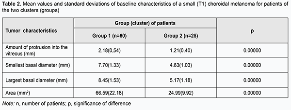 Choroidal melanomas in group 1 were statistically significantly larger in all the four parameters than those in group 2. Amount of protrusion into the vitreous, minimum tumor diameter, maximum tumor diameter, and tumor area for choroidal melanomas in group 1 were 0.97 mm, 3.07 mm, 3.28 mm and 41.60 mm2, respectively, larger than those for choroidal melanomas in group 2 (р = 0.000). Table 3 presents the comparison of the two groups of patients with small (T1) CM, the group with larger tumors (group 1) and the group with smaller tumors (group 2), in terms of treatment outcomes. Although in both groups positive outcomes outnumbered negative outcomes, it was found that the treatment outcome in patients even with small (T1) CM (measuring ≤ 3 mm in thickness and ≤ 12 mm in basal dimension) depended on tumor dimensions and tumor area at baseline. Patients with small CM of more than 2.18-mm protrusion into the vitreous, more than 8.45-mm basal dimension, and more than 66.6 mm2 tumor area were 2.80 times more likely to have a negative treatment outcome.