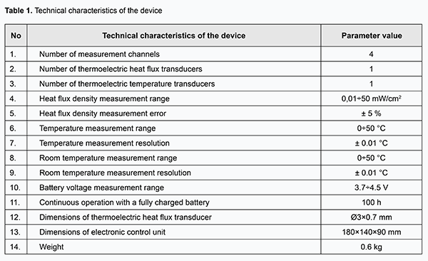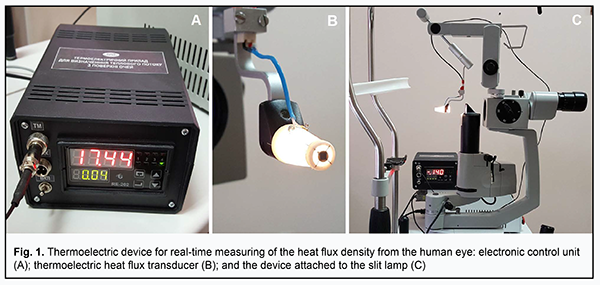 Introduction A wealth of data has been amassed on thermometry and thermography findings on the temperature and temperature distribution in the surface area of the human body and some of its internal organs. The field of knowledge on the temperature of the human body and its organs is well equipped with measurement instrumentation. The methods available for non-contact or contact registration of temperatures in various ocular compartments have their advantages and disadvantages. Non-contact temperature measurement techniques like infrared thermometry or thermorgraphy provide for safe assessment of temperatures and their distribution in the ocular surface, and are used in diagnosing various eye disorders [1-4]. Contact thermometry techniques are used to study temperatures not only of the cornea and sclera, but also of the internal structures of the eye. However, since introduction of the measurement probe into the human eye cannot be considered safe as a routine intraocular temperature measurement procedure, it is justified only if it is performed during surgery through the incision already made for insertion of surgical instrumentation. This is reasonable, e.g., for monitoring temperatures in the eye during vitreoretinal surgery which is usually performed under conditions of artificially induced uncontrolled local hypothermia [5]. Heat process characteristics include not only temperatures and temperature distribution, but also heat flux, which is a major heat exchange index and reflects the function of organs and organs more completely than the two former characteristics [6]. Recently, progress has been made in the development of advanced instrumentation for the local measurement of the heat flux from human body surface. Thermoelectric heat flux transducers have been developed, which have high sensitivity and accuracy and rapid response times, provide robust performance in a wide temperature range, and incorporate interfaces for communication with up-to-date registration equipment [7-9]. The use of these transducers provides for high-accuracy measurement of heat-flux density [10]. However, to the best of our knowledge, there have been no reports on the measurement of heat flux from the eye. Early diagnosis of eye conditions characterized by changes in intraocular circulation and metabolism (inflammation, uveal tumors, glaucoma, etc.) is still a challenge for ophthalmologists. Obviously, impaired ocular circulation and metabolism must be accompanied by changes in heat exchange indices [4, 11]. Thus, relationships of ocular surface temperature with circulation, intraocular pressure, and presence of inflammation or intraocular tumors have been demonstrated [1, 12, 13]. A change in heat characteristics of the eye may occur in early disease, before clinical symptoms are apparent, and recording these characteristics might be a promising approach in early diagnosis of various eye disorders. The purpose of this study was to investigate the heat flux density from the ocular surface using the developed thermoelectric device. Materials and Methods The thermoelectric device for determining the heat flow from the eye has been developed within the framework of the partnership agreement between the Institute of Thermoelectricity of the NAS of Ukraine and MES of Ukraine and the Filatov Institute, and was used for piloting. To the best of our knowledge, there have been no reports on any device for measurement of the heat flow from the eye. Photographs and characteristics of the device are presented in Fig.1 and Table 1, respectively.