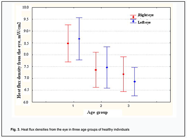 The multichannel device for determining the heat flow from the eye consists of the electronic control unit and the thermoelectric heat-flux transducer. The miniature thermoelectric heat-flux transducer was developed and manufactured for the above device according to the patented proprietary technology of the Institute of Thermoelectricity [14-16]. A thermoelectric micromodule of dimensions 2 × 2 × 0.5 mm incorporates 100 p-type and n-type crystals (0.17 × 0.17 × 0.4 mm) of Bismuth Telluride-based thermoelectric material. The module is placed between two Al2O3–based ceramic plates of 3 mm diameter and 0.1 mm thickness, and has its side faces sealed with a special sealant. Therefore, the manufactured thermoelectric heat-flux transducer is 0.7 mm high and 3 mm in diameter. It is fixed on a custom-made contact prism, the prism-transducer assembly is easily attached to the conventional prism mount of the Goldmann tonometer, and the latter can be connected to slit lamps of various manufacturers. In addition, the assembly can be easily removed for disinfection between patients. The thermoelectric heat-flux transducer is fastened at the center of the contact prism, and comes into direct contact with the individual’s ocular surface (in our study, with the central cornea or scleral conjunctival surface). Aloe of note is that the contact surface of the thermoelectric heat-flux transducer is non-traumatic to the eye (trimmed) and can be easily disinfected. The electronic unit incorporates a heat flux channel for (a) accurate measurement of the voltage generated by the thermoelectric heat-flux transducer and (b) subsequent transformation of the voltage to the physical quantity expressed in heat flux density units (mW/cm2). In addition, it incorporates (a) a temperature measurement channel for accurate measurement of the surface temperature of the investigated target (here, the ocular surface structures) with thermocouple transducer and (b) an ambient temperature measurement channel. The device is provided with a battery power supply. The clinical portion of this study was an open pilot study, followed the ethical standards stated in the Declaration of Helsinki and was approved by the Local Ethics Committee of the Filatov Institute. Written informed consent was obtained from all individual participants included in the study. Thirty-two healthy individuals (64 eyes) who had given written informed consent were under observation. Participant age ranged from 16 to 86 years, and participants were divided into three age groups (16-30, n=11; 31-60, n=10; >60, n=22). They underwent a bilateral eye examination which included measurements of IOP, temperature of the external corneal surface, and heat flux density from the eye. Ocular examination was performed under stable environmental conditions (air temperature and humidity control and minimal indoor air velocity). Before evaluation, participants spent 15 minutes indoors for adaptation to the room environment. They were administered epibulbar anesthesia with ophthalmic 0.5% proparacaine hydrochloride (ALCAINE®, SA Alcon-Couvreur NV, Puurs, Belgium). Temperatures and heat flux density were recorded 15 minutes after instilling a drop of the anesthetic. During evaluation, patients were positioned before a slit-lamp apparatus. The thermoelectric heat-flux transducer came into direct contact with the subject’s central cornea in all cases. Real-time measurements were repeated at least three times for each eye. Fifteen subjects (30 eyes) underwent heat flux density measurements for not only the subject’s central cornea, but also for projections of the pars plana ciliaris in the nasal and temporal quadrants. In these 15 subjects, heat flux density measurements for the central cornea were repeated three times by another examiner 15 minutes after completion of initial three measurements. Statistical analyses Statistical analyses were conducted using Statistica 10.0 (StatSoft, Tulsa, OK, USA) software. Data are presented as mean and standard deviation (SD). Pearson correlation was used to assess the independent correlation between the temperature of the external ocular surface and heat flux density from the eye. A two-tailed Student test was used for group comparisons and the level of significance p ≤ 0.05 was assumed. Results Mean room temperature and relative humidity during examination sessions were 21.3 ± 0.8°С and 48.5 ± 1.6%, respectively. In addition, mean IOP, temperature of the external ocular surface, and heat flux density from the human eye were 16.5±2.7 Hg, 34.6 ± 0.7°С (range, 33 to 36°С), and 7.7±1.3 mW/cm2 (range, 4.9 to 11.7 mW/cm2), respectively. Temperature of the external ocular surface was positively correlated with heat flux density from the eye (r = 0.34; p = 0.006). There was no significant difference in temperature of the external ocular surface or heat flux density from the eye between the right and left eyes (p = 0.78 and p = 0.9, respectively). In the fifteen subjects (30 eyes) that underwent additional measurements, the mean heat flux density for the central cornea was 7.84±1.54 mW/cm2, whereas those for projections of the pars plana ciliaris in the nasal and temporal quadrants were 7.2±1.18 mW/cm2 (p=0.19) and 6.95±0.97 mW/cm2 (p=0.07), respectively. Moreover, in these 15 subjects, heat flux density measurements for the central cornea were repeated three times by another examiner 15 minutes after completion of initial three measurements, and mean heat flux density for the central cornea measured by the first and second examiners was 7.84±1.54 mW/cm2 and 8.1±1.68 mW/cm2, respectively (p = 0.64). We also assessed the relationships of temperature of the external ocular surface and heat flux density from the eye with patient age (Fig. 2, 3). The temperature of the external ocular surface in group 1 (34.9 ± 0.7°С) was somewhat higher than in group 2 (34.6 ± 0.7°С; p = 0.07) and in group 3 (34.6 ± 0.7°С; p = 