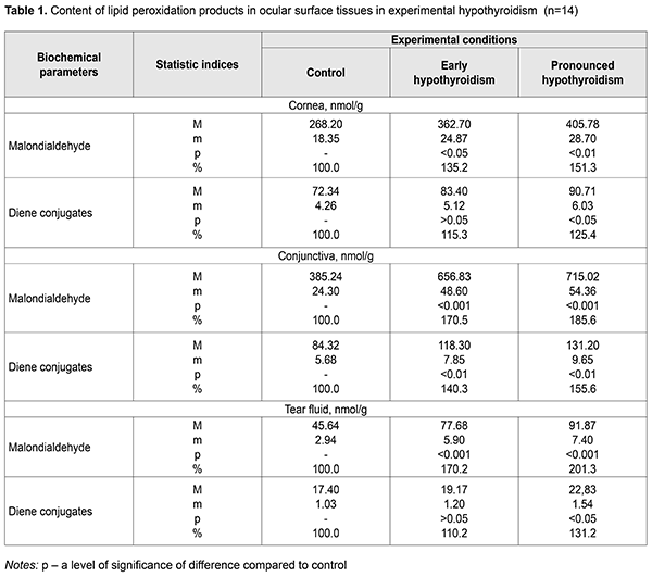 The content of malondialdehyde in the cornea of the animals with early hypothyroidism was increased up to (362.70±24.87) nmol/g, which was 135.2% as compared to control, (268.20±18.35) nmol/g, (р<0.05). In pronounced hypothyroidism, the content of malondialdehyde increased up to (405.78±28.70) nmol/g, equalling 151.3% comparing to control (р<0.01). The content of diene conjugates in the cornea of the animals with early hypothyroidism was increased up to (83.40±5.12) nmol/g, which was 115.3% as compared to control, (83.40±5.12) nmol/g. In pronounced hypothyroidism, the content of diene conjugates increased up to (83.40±5.12) nmol/g, equalling 125.4% comparing to control (р<0.05). As shown in Table 1, the content malondialdehyde in the conjunctiva of the animals with early hypothyroidism was increased up to (656.83±48.60) nmol/g, which was 170.5% as compared to control, (385.24±24.30) nmol/g, (р<0.001). In pronounced hypothyroidism, the content of malondialdehyde increased up to (715.02±54.36) nmol/g, equalling 185.6% hypothyroidism was increased up to (118.30±7.85) nmol/g, which compared to control (р<0.001). The content of diene conjugates in the conjunctiva of the animals with early hypothyroidism was 140.3% as compared to control, (84.32±5.68) nmol/g. In pronounced hypothyroidism, the content of diene conjugates increased up to (131.20±9.65) nmol/g, equalling 155.6% comparing to control (р<0.01). In the tear fluid of the experimental animals, the content malondialdehyde was increased up to (77.68±5.90) nmol/g in early hypothyroidism, which was 170.2% as compared to control, (45.64±2.94) nmol/g, (р<0.001). In pronounced hypothyroidism, the content of malondialdehyde increased up to (91.87±7.40) nmol/g, equalling 201.3% comparing to control (р<0.001). The content of diene conjugates in the tear fluid of the animals with early hypothyroidism was increased up to (19.17±1.20) nmol/g, which was 110.2% as compared to control, (17.40±1.03) nmol/g. In pronounced hypothyroidism, the content of diene conjugates increased up to (22.83±1.54) nmol/g, equalling 131.2% comparing to control (р<0.05). Discussion Summarizing the data on end and intermediate products of lipid peroxidation, malondialdehyde and diene conjugates, respectively, it can be concluded that hypothyroidism activates significantly the processes of peroxidation in ocular tissues. This leads to an accumulation of lipid hydroperoxides in the tear fluid, conjunctiva, and cornea. A rate of how the level of lipid peroxidation products, and mainly of end-product malondialdehyde, is increased depends on a stage of hypothyroidism. The highest malondialdehyde rates are characteristic for pronounced hypothyroidism. Specific mention should be made of a sharp rise in the concentration of malondialdehyde in the tear fluid in all stages of experimental hypothyroidism. In prospect, this fact can be used as an element of diagnosis for ocular surface damage in the underactive thyroid gland. It is interesting to compare our findings with literature data on a state of lipid peroxidation processes and antioxidant system in tear gland tissues [8]. The mentioned paper on studying lipid peroxidation processes, a glutathione level, and peroxidases activity in the tear fluid in experimental hypothyroidism has demonstrated that underactive thyroid gland leads to an increased level of glutathione and a high concentration of malondialdehyde in the studied tissues. In addition, peroxidase activity was three-fold decreased. All these facts are an important element in misbalance between the reduction system of glutathione and processes of oxidative injury of lipids since glutathione is known to decrease the intensity of lipid peroxidation and the accumulation of lipid peroxidation products through a glutathione peroxidase reaction, in which it reduces lipid hydroperoxides. Herewith, glutathione transforms into an oxidized form [4, 8, 18]. Thus, our findings in conjunction with literature data give the evidence that in hypothyroidism there is dysregulation in the processes of lipid peroxidation and the antioxidant system that results in oxidative stress which is known to have a negative effect on the function and protective and adaptive mechanisms of ocular tissues [8, 10, 11, 15, 20] and can be one of pathogenetic elements in the development of dry eye syndrome in hypothyroidism. In conclusion, firstly, it was found that the rats with experimental hypothyroidism had the activated lipid peroxidation processes in the ocular tissues, which is evidenced by the increased content of malondialdehyde and diene conjugates in the conjunctiva by 85.6% and 55.6%, respectively, and in the cornea by 51.3% and 25.4%, respectively, especially in pronounced hypothyroidism. Secondly, it was found that in experimental hypothyroidism the highest rates of malondialdehyde and diene conjugates were noted in the tear fluid: by 70.2% and 101.3% in early and pronounced hypothyroidism, respectively. This parameter can be considered as a diagnostic criterion characterizing a state of oxidative stress in ocular surface tissues in hypothyroidism even in the early stage of hypothyroidism development. References 1.Horodynska OYu, Bobyriova LYe. [Prognostic characteristics of hypothyroidism prevalence in the poltava region and in ukraine under conditions of iodine deficiency]. Mizhnar. endokryn. zhurn. 2016;2(74):44-8. In Ukrainian. 2.Nasledov A. [SPSS computer data analysis in psychology and social science]. Spb.:Piter;2005. 416p. In Russian. 3.Pavlovska GYa, Pavliv OB, Pavlovskii MI, Paster SYa. [Dry keratoconjunctivitis in patients with hypothyroidism]. [Proceedings of XIII Ukrainian Congress of Ophthalmologists. 21-23 May 2014]. Odessa; 2014:37-8. In Ukrainian. 4.Babu K, Jayaraaj IA, Prabhaka J: Effect of Abnormal thyroid hormone changes in lipid peroxidation and Antioxidant imbalance in Hypothyroid and Hyperthyroid patients. Int J Biol Med Res. 2011; 2(4): 1122-6. 