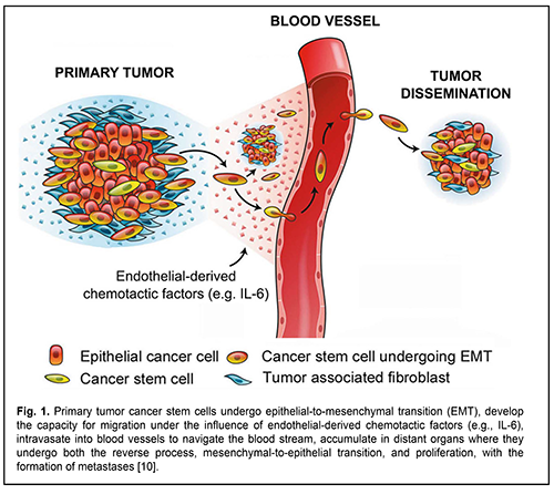 Malignant head and neck tumors are the 6th most common cause of morbidity and mortality due to cancer worldwide [1]. In Ukraine, they make up approximately 6% of the total human tumors [2], and, 45% of paranasal sinus and nasopharynx neoplasms grow into the orbit, making the diagnosis and treatment of this disorder an interdisciplinary issue [3]. Squamous cell carcinoma is the most common head and neck cancer. It is well known that the clinical course of and efficacy of treatment for malignant neoplasms are largely dependent on the development and spread of metastases, when steady-state cancer cells migrate through the bloodstream, extravasate, adapt to the new environment and evoke malignant growth at remote sites in the body, thereby aggravating the prognosis. New data on the role of stem cells in the development of malignant neoplasms have been presented in recent years. Our understanding of the mechanisms of oncogenesis has been improved by reports on the evidence of heterogeneity of primary tumors with respect to genetic, antigenic and other characteristics, providing a basis for positing that the development of malignant tumor metastases and recurrences is largely mediated by particular cell clones, cancer stem cells (CSC) [4-6]. The main features of CSC include high capacity for migration, resistance to radiation and drugs, differential mimicry, fusion with host cells, induction of neovascularization, and inhibition of both some immune responses and tumor growth [7-9]. Cancer stem cells differing in tumor types vary in surface markers. Although СD133, СD44, СD24 and epithelial specific antigen (ESA+) are considered major markers for CSC of solid tumors, site-specific proteins can be also identified. Malignant head and neck tumors can also express tumor markers [10, 11]. Recent studies have demonstrated that multipotent stem cells having a high tumor potential contribute to the formation of metastases of head and neck squamous cell carcinoma (HNSCC). Particularly, it has been shown that cancer stem cells reside in perivascular niches and are characterized by high aldehyde dehydrogenase (ALDH) activity and high CD44 expression (ALDHhighCD44high) in HNSCC [12]. A group of researchers from the Massachusetts Institute of Technology and Harvard Medical School developed a single-cell expression atlas of HNSCC primary tumors and metastases. In addition, they characterized the transition involving malignant and non-malignant cells within the tumor microenvironment which drives tumor spread. Cells expressing the partial epithelial-to-mesenchymal transition (p-EMT) spatially localized to the leading edge of primary tumors [1]. There is a growing evidence of the role of EMT in metastasis, with loss of E-cadherin-dependent cell-cell adhesion resulting in (a) a loss both of tumor cell capacity for close cell-cell contact and their adhesive properties and (b) increase in tumor cell motility and capacity for migration to and invasion of adjacent tissues and remote organs [13], where they regain their epithelial properties in a process called mesenchymal-to-epithelial transition (MET), which causes the formation of metastases [14, 15]. Inhibition of CDH1 expression leads to E-cadherin downregulation and is a factor influencing EMT [16]. A study by Beerling et al [17] demonstrated that the tumor cells that have lost E-cadherin expression and display a mesenchymal phenotype can migrate in vivo. In vitro cell line studies [20] and in vivo model studies [21, 22 ] have shown that EMT is induced by soluble growth factors, transforming growth factor alpha (TGF-?), interleukin-6 (IL-6) and transforming growth factor beta (TGF-?), and extracellular matrix molecules activating transcription factors Snail, Twist, Slug, ZEB1, ZEB2, Lef-1, etc. The endothelial cells secreting antiapoptotic protein Bcl-2 stimulate epithelial to mesenchimal transition and enhance the invasive capacity of CSC in patients with HNSCC. IL-6 enhances the capacity of CSC for migration and survival, and endothelial cell IL-6 secretion is a mechanism of tumor progression. Analysis of tissue microarrays generated from the invasive fronts of 77 HNSCC patients followed-up for up to 11 years [12] revealed that high expression of IL-6 receptor or co-receptor gp130 correlates with low HNSCC patient survival. Blockade of the IL-6 pathway with a humanized anti-IL-6R antibody (tocilizumab) inhibited endothelial cell-induced motility in vitro and decreased the fraction of cancer stem cells in vivo. Xenograft HNSCC tumors vascularized with IL-6-knockout endothelial cells exhibited slower tumor growth and smaller cancer stem cell fraction. That study showed that endothelial cell secreted IL-6 enhanced the motility and survival of cancer stem cells. These findings (a) provide grounds for asserting that, endothelial-derived IL-6 contributes to movement of cancer cells of the tumor and CSC through blood vessels to adjacent tissues where metastases develop, and (b) substantiate the potential for controlling metastasis process through administration of inhibitors of IL-6 production (Fig. 1) [12].