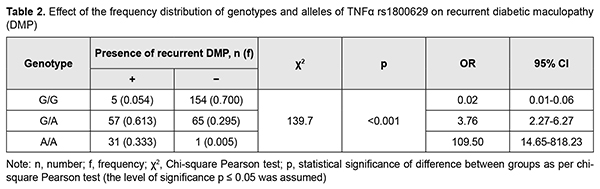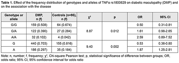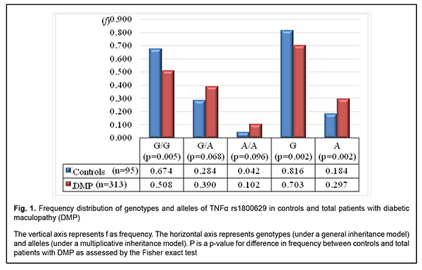 Introduction Ocular complications (particularly, diabetic retinopathy (DR) and diabetic maculopathy (DMP)) are one of the most common complications associated with type 2 diabetes mellitus (T2DM) [1-3]. In addition, DMP develops not in any patient with DR, but DMP incidence increases with an increase in severity of DR. Thus, DMP develops in 3-38% of patients with non-proliferative DR (NPDR), 20-63% of those with pre-proliferative DR, and above 70%% of those with proliferative DR (PDR). It has been reported that pro-inflammatory cytokines, particularly, tumor necrosis factor alpha (TNF?), are important for the development of insulin resistance [4]. The role of TNF? in signaling from the insulin receptor (specifically, inhibiting insulin receptor substrate (IRS)-1 and tyrosine phosphorylation of the insulin receptor and thus suppressing further activation of PI3K/Akt and ERK/MAP kinase pathways and uptake of glucose) constitutes the molecular basis for this effect [5, 6]. Therefore, TNF?-induced IRS-1 inactivation is a mechanism for the development of insulin resistance [7]. In addition, three novel proteins (RIPK1, BIRC2 and BIRC3) have been identified through computational analysis of TNF? protein network, and network analysis showed the interconnectivity between signaling pathways such as TNF receptor, NFkB, Toll-like receptor and apoptosis; these proteins also effect the development of insulin resistance [8]. Genetic factors, particularly, gene polymorphisms, contribute to the development of T2DM and its complications [8-13]. A meta-analysis was applied to integrate the findings from 10 studies (with a total of 1425 T2DM patients and 1116 healthy control subjects) to provide an overall assessment whether TNF-? -308G>A (rs1800629) polymorphism is associated with T2DM risk in a population of Han Chinese subjects. The pooled ORs (95% CIs) for TNF-? -308G>A of A vs. G allele and G/A+A/A vs. G/G genotype were 1.63 (1.17–2.25) and 1.47 (1.17–1.85), respectively [9]. A Brazilian study [10] involving 745 outpatients with T2DM, including 331 subjects without DR, 246 with NPDR, and 168 with PDR, demonstrated that the A allele of the –308G>A polymorphism was (a) more frequent in subjects with PDR than in those with no DR (18.1% vs. 11.5%, corrected P = 0.035), and (b) independently associated with an increased risk of PDR, under a dominant model (adjusted odds ratio [aOR], 1.82; 95% con?dence interval [CI], 1.11–2.98). Indian studies [11, 12] showed the association of TNF-? -308G/A (rs1800629) with the development of T2DM and its complications, which was accompanied by increased blood levels of TNF?, IL-6 and SDF-1. A systemic overview by Luna et al [13] noted contradictory results of prior studies aimed at establishing associations between TNF-? -308G/A (rs1800629) and T2DM in various populations. They believe that ethnic differences may play a role in these conflicting results; the results of these studies suggest the need for further investigation. Therefore, the data above pointed to an association of TNF-? -308G/A (rs1800629) with T2DM and its complications (particularly, DR and DMP), and provided evidence on the need for investigating a possible association of this SNP with recurrent DMP after surgery in a Ukrainian population of patients with T2DM. The purpose of this study was to investigate the value of TNF-? -308G/A (rs1800629) in recurrent DMP after surgery in a Ukrainian population of patients with T2DM. Material and methods The study included 313 patients with DM2 (313 eyes) and diabetic maculopathy. These included patients with mild NPDR (Group 1; n=40), moderate or severe NPDR (Group 2; n=92), and PDR (Group 3; n=181). Ninety-five age- and gender- matched individuals without ocular disorders were used as controls. The patients were ethnic Ukrainians and were not relatives. Each patient underwent an eye examination which included visual acuity assessment, static Humphrey perimetry, refractometry, slit lamp biomicroscopy, gonioscopy, ophthalmoscopy with Volk Super Field lens and Goldmann three-mirror lens (Volk Optical, Mentor, OH) and fundus photography (the ETDRS seven standard fields) and fluorescent angiography with the fundus camera TRC-NW7SF (Topcon, Tokyo, Japan). In addition, they underwent spectral domain optical coherence tomography (SD-OCT; Copernicus REVO, Optopol Technology Sp, zo.o, Zawiercie, Poland; scan programs, Retina 3D and Retina Raster) and OCT (Retina Angio mode, 6 x 6 mm). Severity of DR and DMP was graded as per the 2002 guidelines of the American Academy of Ophthalmology [3]. Indications for surgical intervention were progressive vision loss; visual field defects in the central and paracentral regions; changes in the quality of vision in the presence of (a) NPDR with refractive macular edema or macular edema with the presence of tangential tractions resulting from incomplete detachment of the posterior hyaloid membrane of the vitreous, (b) PDR with refractive macular edema, presence of epiretinal membranes or presence of tangential or axial retinal tractions and imminent tractional retinal detachment, (c) presence of vitreous, preretinal and/or subhyaloid hemorrhage [14]. Patients received one of the four types of surgical treatment: only three-port closed subtotal vitrectomy (CSTV; n=78); CSTV combined with internal limiting membrane (ILM) peeling (n=85); CSTV combined with ILM peeling and panretinal laser coagulation (PRLC) (n=81); and CSTV combined with ILM peeling, PRLC and cataract phacoemulsification (n=69). Follow-up visits were at months 1, 3, 6 and 12 after surgery. Enzyme-linked immunosorbent assay (ELISA) was used to measure blood TNF? levels with kits from Bender Medsystems (Austria). The intensity of staining of the enzymatic reaction product was measured quantitatively with a Multiskan Ex plate reader (ThermoFisher Scientific, Vantaa, Finland). TNF-? -308G/A (rs1800629; locus, 6p21.33) polymorphism was investigated by real-time polymera