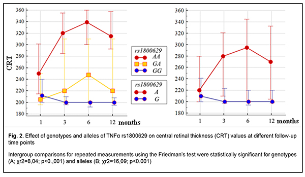 CRT0 values were higher (a) in heterozygous G/A or minor homozygous A/A carriers than in ancestral homozygous G/G carriers (р=0.013) and (b) in A allele carriers than in ancestral G allele carriers (р = 0.003). There was no significant difference in ETDRS severity score under conditions of such distribution (p > 0.1). Therefore, among patients with recurrent DMP, carriers of the A allele of the TNF-? (rs1800629) SNP had a greater CRT before surgery. In addition, minor homozygous A/A carriers exhibited a greater CRT (Fig. 2A) at any follow-up time point (р < 0.001). Moreover, such patients showed a somewhat gradual increase in median CRT at subsequent follow-up visits after month 1 (р < 0.001). Furthermore, CRT was 1.1-fold to 1.5-fold greater in minor A allele carriers than in ancestral G allele carriers at any follow-up time point (р < 0.001). Therefore, among the patients treated for DMP, CRT was greater in the risk A/A genotype carriers and risk A allele carriers, and did not decrease in these risk patients within the follow-up period. This confirmed the pathogenetic role of the TNF-? (rs1800629) SNP in the development of DME in recurrent DMP after surgery. A series of univariate logistic regression models were built to prove the impact of the TNF-? (rs1800629) SNP on recurrent DMP, development of DME, TNF-? levels, CRT, and, correspondingly, on severity of DR (ETDRS scale). The model analysis demonstrated that the TNF-? (rs1800629) SNP exerted a significant effect on recurrent DMP (р < 0.001) and development of DME (р ? 0.001) at all follow-up time points, and a significant effect on an increase in TNF-? blood levels (р = 0.002) and on CRT at baseline (р = 0.008), at month 1 (р = 0.006) and at subsequent follow-up time points (р < 0.001). Therefore, the results of the model analysis proved the impact of the SNP on recurrent DMP after surgery. Discussion Dozens of studies reporting on identification of associations of SNPs of proinflammatory cytokine genes (TNF?, IL-6 and IL-1?) with T2DM and its complications have been subjected to a meta-analysis [17]. Individual SNP analysis showed the highest association of TNF-? rs1800629-A/A genotype (OR?=?2.75, 95% CI?=?1.64-4.59, P?=?0.001) with T2DM and diabetic nephropathy [18]. Those authors related it to the fact that TNF-? expression was increased by more than four-folds (n-fold=4.43±1.11), which was accompanied by a substantial increase in TNF-? blood level in T2DM patients carrying the minor A/A genotype [18]. Another study [19] found that the minor A/A genotype and minor A allele of rs1800629 significantly increased TNF-? blood level, which was more expressed in patients with complications of T2DM. Therefore, one can identify the following pattern of pathogenetic relationship: carriage of the minor A allele is a pathogenetic factor for T2DM and its complications, with TNF-? overexpression leading to excessive TNF-? production. With regard to our findings, it can be noted that TNF-? (rs1800629) polymorphism was associated not only with the development of DMP in T2DM, but also with the development of recurrent DMP after surgery. This could be explained by elevated blood TNF-? levels in A allele carriers. Conclusion First, distributions of genotypes and alleles of the TNF? rs1800629 were associated with the development of the disease (р=0.012 and р=0.002, respectively) in a Ukrainian cohort of patients with DR, DMP and T2M. Carriers of genotypes with the minor A allele had a 2.0-fold higher risk of developing DMP (under a dominant model, OR = 1.82; 95% CI, 1.23–3.24’ p = 0.004). Second, the minor A/A genotype at rs1800629 determined the development of recurrent DMP, and 96.9% of its carriers exhibited recurrent DMP in the postoperative period. The heterozygous G/A genotype at rs759853 was associated with an increased risk (OR = 3.76; 95% CI: 2.27-6.27), whereas the homozygous ancestral G/G genotype, with a decreased risk (OR = 0.02; 95% CI: 0.01-0.06) for recurrent DMP. Recurrent DMP frequency did not depend on DR stage, surgical technology or follow-up time point. Third, carriage of the minor A allele of the TNF? rs1800629 polymorphism was associated with a greater CRT both at baseline and within 12 months after surgery. CRT was 1.1-fold to 1.5-fold greater in minor A allele carriers than in ancestral G allele carriers at any follow-up time point (р < 0.001), and did not decrease in A-allele carriers within the follow-up period. Finally, our findings and analysis of recent literature allow us to state that an elevated TNF? blood level in carriers of the minor A-allele of the TNF? rs1800629 polymorphism was a pathogenetic factor promoting recurrent DMP after surgery. References 1.Pankiv VI. [Workshop No. 162. Diabetes mellitus: Diagnostic criteria, etiology and pathogenesis]. Mizhnarodnyi endokrynologichnyi zhurnal. 2013;8:53-64. Ukrainian. 2.Type 2 Diabetes Complications. Web-resource: https://www. endocrineweb.com/conditions/type-2-diabetes/type-2-diabetes-complications 3.Balashevich LI, Izmailov AS. [Diabetic ophthalmopathy]. St Petersburg: Chelovek; 2012. Russian. 4.Liu C, Feng X, Li Q, Wang Y, Li Q, Hua M. Adiponectin, TNF-? and inflammatory cytokines and risk of type 2 diabetes: A systematic review and meta-analysis. Cytokine. 2016 Oct;86:100-9. 5.IRS1 – Insulin receptor substrate 1 – Homo sapiens (Human) – IRS1 gene & protein". www.uniprot.org. Retrieved 2016-04-21. 6.Takaguri A. [Elucidation of a new mechanism of onset of insulin resistance: effects of statins and tumor necrosis factor-? on insulin signal transduction]. Yakugaku Zasshi. 2018;138(11):1329-1334. Japanese. 7.Copps KD, White MF. Regulation of insulin sensitivity by serine/threonine phosphorylation of insulin receptor substrate proteins IRS1 and IRS2. Diabetologia. 2012;55(10):2565-82. 8.Jamil K, Jayaraman A, Ahmad J, Joshi S, Yerra SK. TNF-alpha -308G/A and -238G/A polymorphisms and its protein network associated with type 2 diabetes mellitus.