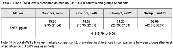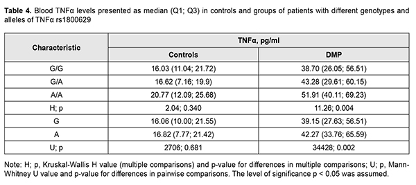 Table 4 presents median blood TNF? levels in our patients with different genotypes of rs1800629.