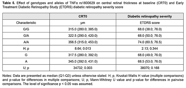 It is noteworthy that median blood TNF? levels were 2.4-fold to 2.6-fold higher in patients with any genotype of rs1800629 than in controls (р < 0.001). In addition, blood TNF? levels in carriers of risk A/A genotype and A allele were higher than in carriers of other genotypes; this was true both for patients with DMP and controls, but the difference was statistically significant only for patients. Moreover, differences in these levels for patients with different genotypes and for those with different alleles of rs1800629 were also significant (p = 0.004 and р=0.002, respectively). In addition to vascular manifestations, diabetic macular edema (DME) is of importance in patients with DMP. Previously, we have found it in eyes with central retinal thickness (CRT) of more than 250 ?m [15]. It was found that DME frequency in recurrent DMP increased with an increase in time between surgery and follow-up and did not depend on surgical technique. At 1 month, 3 months and 12 months after surgery, DME was found in 30.4%-53.3%, 73.3%-86.7%, and 68.4%-100% of eyes with recurrent DMP. Preoperative CRT value varied from 195 ?m to 880 ?m (median value, 358.09±6.96 ?m). There was no statistically significant difference in preoperative CRT between groups; this is in agreement with the idea of a decisive value of preoperative clinically significant DME that affected visual acuity and was an indication for surgery [3]. Postoperatively, in all groups, CRT decreased by 113-118 ?m and became normal (р < 0.001). No significant difference in CRT between groups was observed at any follow-up time point (p > 0.2). Identifying a relationship of the TNF-? (rs1800629) SNP with baseline CRT (CRT0) and severity level of DR (ETDRS scale) was also of some interest (Table 5) [16].