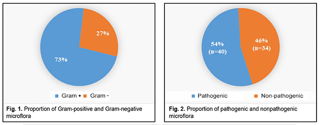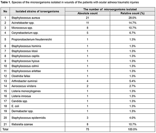 Table 1 shows that the leading positions were taken by Staphylococcus aureus (n=21), Acinetobacter spp.(n=11), Кlebsiellа ozenae (n=8), Micrococcus spp. (n=8), Corynebacterium spp. (n=5), Artrobacter cuminsii (n=4), Staphylococcus epidermidis (n=3). The rest of the strains were revealed infrequently.