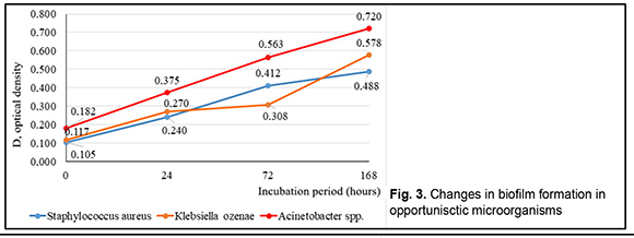Considering the frequency of microorganism isolation and the ability to form biofilms, we revealed Staphylococcus aureus, Acinetobacter spp., Кlebsiellа ozenae, Micrococcus spp., Corynebacterium spp., Arthrobacter cuminsii, and Staphylococcus epidermidis. Based on the data in Table 2, it can be concluded that most microorganisms form biofilms in vitro. Most of all, this ability is shown in Staphylococcus aureus, Acinetobacter spp. and Кlebsiella ozenae, which are opportunistic pathogens. The rest of the strains are characterized by a weaker ability to form biofilms. The difference was considered to be statistically significant with p<0.05.Figure 3 demonstrates the changes in forming biofilms by opportunistic pathogens.