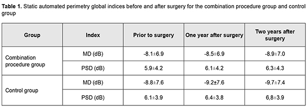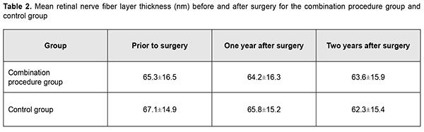 In patients of group 1, mean RNFL thickness was 65.3±16.5 nm before operation, and insubstantially decreased to 64.2±16.3 nm and 63.6±15.9 nm at month 12 and month 24, respectively. In patients of the control group, mean RNFL thickness was 67.1±14.9 nm before operation, and 65.8±15.2 nm and 62.3±15.4 nm at month 12 and month 24, respectively, but the difference was not significant. Preoperatively, vertical cup-to-disc ratio, neuroretinal rim area and neuroretinal rim volume were 0.67±0.21, 0.98±0.33 mm2, and 0.23±0.12 mm3, respectively, for the combination procedure group, and 0.62±0.14, 0.99±0.30 mm2, and 0.25±0.13 mm3, respectively, for the control group. Patients of both groups exhibited practically no change in morphometric characteristics of the optic disc at month 12 and month 24.