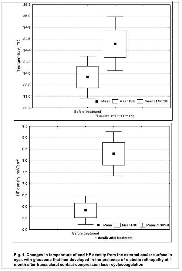 Introduction Heat exchange processes in biological objects (e.g., cells, organs and bodies) are subject to the laws of thermodynamics that studies general regularities of energy transformation and transmission. Biological objects could be considered as the open thermodynamic systems that are not under heat equilibrium conditions and in which heat transfer always takes place [1-3]. Heat transfer requires the existence of a thermal gradient that is a heat flow (HF) condition. HF, as opposed to temperature, has a certain direction, and is directed toward a decrease in temperature. A notion of HF density is used as a quantitative measure of heat distribution intensity. HF density is defined as an amount of heat flowing through a unit of isothermic area within a defined unit of time [3]. A thermal gradient between the outer and inner eye portions has been demonstrated in experimental studies [4]. Previously, we have reported the first results of direct HF density measurements in the ocular surface in healthy individuals, and found a relationship between the individual’s age and ocular HF density [5]. Our preliminary data demonstrated, in patients with diabetic retinopathy, there was a statistically significant difference in ocular HF density, but not in corneal temperature between patients differing in disease stage. In addition, we noted a relationship between ocular HF density and rheographic coefficient (RQ) as assessed by rheoophthalmography [6]. The heat processes in patients with diabetes mellitus, however, are still poorly understood [7]. The purpose of the study was to examine temperature of and HF density from the ocular surface in the eyes of patients with neovascular glaucoma that had developed in the presence of proliferative diabetic retinopathy (PDR). Material and Methods This open pilot study followed the ethical standards stated in the Declaration of Helsinki and was approved by the Local Ethics Committee of the Filatov Institute. Written informed consent was obtained from all individuals enrolled in the study. Twenty-five patients (50 eyes; age, 32 to 64 years; mean age, 54 ± 9.1 years) with PDR in both eyes were under observation. In each patient, one eye was diagnosed with terminal neovascular glaucoma. Not later than one month before the study, each patient had undergone anterior panretinal laser photocoagulation which did not result in complete regress of new vessels and normalization of intraocular pressure (IOP). In each patient, to reduce IOP, the study eye received twice-a-day instillations of brimonidine, a carbonic anhydrase and beta-blocker inhibitor. The fellow eye, however, received no medical agent instillation. Patients underwent examinations in both eyes as follows: best-corrected visual acuity testing, IOP measurements, and measurements of temperature of the external corneal surface and HF density from the eye. The thermoelectric device developed within the framework of the partnership agreement between the Institute of Thermoelectricity of the NAS of Ukraine and MES of Ukraine and the Filatov Institute of the NAMS of Ukraine was used for measurements of temperature of the external ocular surface and HF density from the eye [5]. Studies were performed under stable environmental conditions (air temperature and humidity control and minimal indoor air velocity). During the study period, the mean temperature in the room was 22.5 ± 1.7 °С. Before evaluation, patients spent 15 minutes indoors for adaptation to the room environment. Patients were administered epibulbar anesthesia with ophthalmic 0.5% proparacaine hydrochloride (ALCAINE®, SA Alcon-Couvreur NV, Puurs, Belgium). Temperatures and HF density were recorded 15 minutes after instilling a drop of the anesthetic. During data acquisition, patients were positioned before a slit-lamp apparatus. The prism-transducer assembly was attached to the conventional prism mount of the Goldmann tonometer, and the thermoelectric HF transducer came into direct contact with the subject’s central cornea in all cases. At least three real-time measurements were obtained for each eye. Corneal surface temperature, HF density from the eye and IOP were assessed before and at 1 month after laser treatment. Laser treatment included three sessions of transscleral contact-compression laser cyclocoagulation (TSCC LC) using a Neodymium: yttrium-aluminum-garnet (Nd: YAG) laser with ?=1064 nm and with a 600 µm quartz fiberoptic polymer contact probe for dosed compression of the sclera. Impulse laser energy was 0.8 J [8]. A TSCC LC was performed every other day. Statistical analyses were conducted using Statistica 10.0 (StatSoft, Tulsa, OK, USA) software. Means and standard deviations (SD) were calculated. The Student t-test was used to assess post-treatment changes in IOP, corneal surface temperature, and HF density from the eye. The level of significance p ? 0.05 was assumed. Results Best-corrected visual acuity of all affected eyes remained as a perception of light with an inaccurate projection of rays. Before laser treatment, mean IOP in glaucomatous eyes was 36.3±5.4 mmHg, and in fellow eyes, 18.3 ± 2.8 mmHg (p = 0.00). In addition, mean corneal surface temperature in glaucomatous eyes was 33.9 ± 0.9°С, and in fellow eyes, 34.4 ± 1.0°С (p = 0.08). Moreover, mean HF density from the eye in glaucomatous eyes was 5.8 ± 1.6 mW/cm2, and in fellow eyes, 6.9 ± 1.4 mW/cm2 (p = 0.02). At 1 month after treatment, mean IOP in glaucomatous eyes decreased from 36.3±5.4 mmHg to 25.8 ± 4.6 mmHg (p = 0.00), i.e., by 10.5 mmHg (29%), and mean IOP in the fellow eyes was 19.1 ± 2.4 mmHg. In addition, mean corneal surface temperature in glaucomatous eyes was 34.5 ± 0.9°С, and in fellow eyes, 34.2 ± 0.7°С (p = 0.38). Moreover, mean HF density from the eye in glaucomatous eyes was 8.3 ± 1.99 mW/cm2, and in fellow eyes, 7.03 ± 1.9 mW/cm2 (p = 0.07). Fig. 1 presents changes in mean corneal surface temperature and mean HF density 