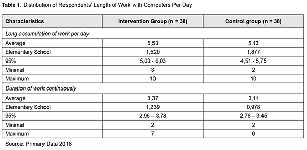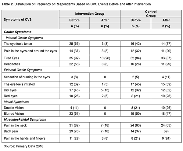 2.Respondent Frequency Distribution Based on CVS Events Before and After Intervention The frequency distribution of CVS complaints experienced by respondents (Table 2) showed that there was a decrease in the frequency of CVS symptoms after a trick intervention 20-20-20 in the intervention group. The symptoms that most often appear in the intervention group before the trick is done 20-20-20 are tired eyes as many as 35 people (92%) decreased to 10 people (26%), neck pain as many as 31 people (82%) decreased to 7 people ( 18%), back pain 29 people (76%), decreased to 7 people (18%), eyes felt tense as many as 25 people (66%) decreased to 3 people (8%), and no more respondents experienced vision running away from the original 23 people (61%). In the control group there were not many changes in CVS complaints experienced by respondents, there was a slight decrease in the frequency of symptoms, there were even some symptoms that experienced a slight increase in frequency. CVS complaints that most often appear in the control group are tired eyes, on the initial examination there were 32 people (84%) and when the final examination increased to 33 people (87%), then neck pain was 24 people (63%) and not there is a change in frequency after working for 5 days.
