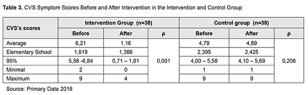 3.Scores of CVS Symptom Before and After Intervention in the Intervention and Control Group Based on CVS scores experienced by respondents (table 3) it appears that the number of CVS symptoms experienced by respondents in the intervention group averaged 6.21 symptoms, a minimum of 2 symptoms and a maximum of 9 symptoms. After the intervention decreased to 1.16 symptoms with symptoms of at least 0 symptoms and a maximum of 4 symptoms. While in the control group, CVS symptom scores experienced by respondents in the initial examination averaged 4.79 symptoms with a score of at least 1 symptom and a maximum of 9 symptoms and not too many changes when examined after 5 working days obtained an average number of symptoms experienced by 4.89 symptoms of respondents with a value of at least 1 symptom, a maximum of 9 symptoms. Based on the results of the Wilcoxon Statisk test of CVS complaints before and after intervention in the control group, a Significancy number of 0.001 was obtained. Because the value of ? <0.05, it can be concluded that there are significant differences in CVS incidence scores between respondents before and after the intervention of tricks 20-20-20. Whereas the control group obtained a Significancy number of 0.206. Because the value of ?> 0.05 can be concluded that there is no significant difference in the CVS incidence score between before and after treatment.