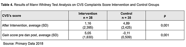 4.Results of the Mann Whitney Test of CVS Complaints Score in the Intervention and Control Groups The results of the Mann-Whitney test analysis (table 4) between the intervention group and the control group on the CVS complaint score after applying trick intervention 20-20-20 for 5 days working with computers obtained a significance value of 0.001 (? <0.05) indicating that there was a significant difference between CVS incidence scores in the intervention group and the control group after applying the intervention, the difference in the mean difference between the intervention and control groups after treatment was 3.73. Based on the pre and post intervention gain score, it was found that the average gain score of CVS complaints before and after intervention in the experimental group was 5.05 while in the control group -0.11 the results of the statistical test showed a value of ? = 0.001 which means there are significant differences between the gain values score of CVS pre and post complaints in the intervention and control groups.