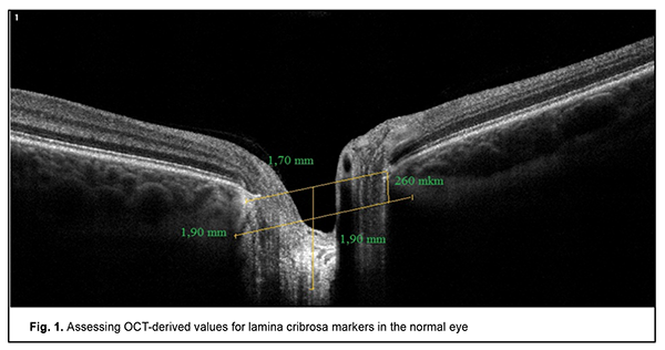 Introduction The lamina cribrosa is an important ocular structure through which the retinal ganglion cell axons and retinal blood vessels pass. Advances in imaging techniques, particularly optical coherence tomography (OCT), allowed for non-invasive research on the cribriform plate and optic disk. Before the use of OCT, the pathological changes of highly myopic eyes in human could only be studied in enucleated globes and ocular structures were measured histomorphometrically [1]. There have been a number of reports on studies (mostly in patients with glaucoma) on the state of the cribriform plate using various OCT modalities such as adaptive optics scanning laser ophthalmoscopy (AO-SLO) [2], swept source OCT (SS-OCT) [3, 4, 6] and enhanced depth imaging-optical coherence tomography (EDI-OCT) [5]. As myopia progresses, the eye stretches and this leads to degenerative conditions developing with age in the posterior pole. Unfortunately, OCT apparatuses with an EDI-OCT mode are poorly available in Ukraine. In addition, to the best of our knowledge, there have been no reports on studies on the state of the lamina cribrosa in patients with various degrees of myopia. Understanding the pathogenesis of changes in the lamina cribrosa in myopic eyes will lead to the development of advanced treatments and early prevention strategies. The purpose of the study was to investigate morphological characteristics of the lamina cribrosa in mild myopes, moderate myopes, and severe myopes versus generally healthy individuals (controls). Material and Methods One hundred and twenty patients (204 eyes; 64 women (53.3%) and 56 men (46.7%)) with mild, moderate or severe myopia were supervised and examined at the municipal healthcare institution (Regional Clinical Hospital for Emergency and Disaster Medicine) and Zir medical center by the staff of Ophthalmology Department of Kharkiv National Medical University. The control group comprised 20 age- and gender-matched generally healthy volunteers (11 women and 9 men). All study participants were of working age and between 18 and 45 years. The mean age of patients was 31.5 ±13.5 years. Fourier-Domain OCT of the outer portion of the optic disc was conducted using an RTVue-100 instrument (Optovue Incorporated, Fremont, CA). The RTVue software version 6.11 was used to calculate the optic disc parameters based on the LC morphology markers we designed [1, 2, 3]. This lamina cribrosa scanning methodology may be adapted for widely available OCT systems, and does not require specialized devices, additional software and/or additional equipment to be installed on or attached to the OCT system. Fig. 1 presents an example for OCT-assisted assessment of the LC morphology markers.