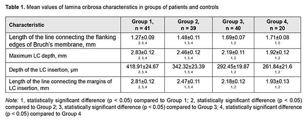The study was performed in compliance with bioethical principles adopted by the First National Congress on Bioethics (Ukraine, Kyiv, 2001) and approved by a local Bioethics Committee of the Kharkiv National Medical University. Patients were divided into three groups based on the severity of myopia: Group 1 of 41 high myopes (19 women [(47.06 ± 12.11) %] and 22 men [(52.94 ± 12.11) %]); Group 2 of 39 moderate myopes (18 women [(46.67 ± 12.88)%] and 21 men [(53.33 ± 12.88) %]); and Group 3 of 40 low myopes (23 women [(60.71 ± 9.23)%] and 17 men [(39.29 ± 9.23)%). Group 4 (controls) comprised 20 generally healthy individuals (40 eyes; 11 women [(58.33±14.23)%] and 17 men [(41.67±14.23)%). The RTVue software version 6.11 was used to calculate lamina cribrosa characteristics for all study patients based on the LC morphology markers we designed. Findings of previous studies [2, 3, 4] on the structure of the lamina cribrosa have been taken in account to develop markers assisting in identification of the structure and morphological features of the lamina cribrosa in patients with various degrees of myopia. The developed markers were adapted for the OCT apparatus and software that had been authorized for use in Ukraine. Length of the line connecting the flanking edges of Bruch’s membrane, maximum LC depth, depth of the LC insertion, and length of the line connecting the margins of LC insertion were assessed. Results and Discussion Table 1 presents mean index values for study groups. There was a significant difference in LC characteristics in patients of Groups 1 and 2 versus controls (Group 4). In addition, there was a significant difference in LC characteristics between groups of patients with various degrees of myopia (Group 1 vs Group 2 vs Group 3).