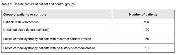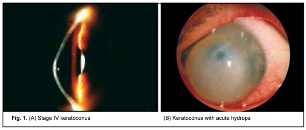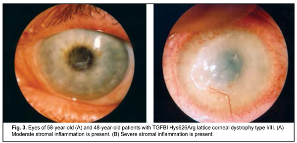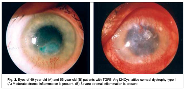 The results of the genetic study in 106 patients with keratoconus (212 eyes; age, 10 years to 67 years; mean age, 31.5±11.82 years) were subjected to analysis. Patients were mostly males (65%). Sixty-nine patients with LCD (46 patients with TGFBI Arg124Cys LCD type I and 23 patients with Hys626Arg LCD type I/IIIA) underwent molecular genetic studies. Of these, 56 had recurrent corneal erosion (RCE) and 13 had no history of corneal erosion. Clinical examination All patients underwent a routine eye examination including uncorrected (UCVA) and best-corrected visual acuity (BCVA) assessment, biomicroscopy, fluorescein testing, tonometry and ophthalmoscopy. In addition, patients with keratoconus underwent keratotopography, pachymetry, remote biometry and gonioscopy. Twenty-four eyes had stage I keratoconus (astigmatism ? 5.0 D; keratometry, ? 48.0 D; visual acuity, 0.5 to 1.0), 52 eyes had stage II (astigmatism, 5.0 to 8.0 D; keratometry, ? 53.0 D; pachymetry, ? 400 ?m; visual acuity, 0.1 to 0.4), 44 eyes had stage III (astigmatism, 8.0 to 10.0 D; keratometry, > 53.0 D; pachymetry, 300 to 400 ?m; visual acuity, 0.12), and 83 eyes had stage IV (keratometry, > 55.0 D; pachymetry, <200 ?m; visual acuity, 0.01 to 0.02) (Amsler-Krumeich classification). Genetic examination Genomic DNA samples were isolated from peripheral blood lymphocytes using proteinase K digestion of the cell lysate and subsequent phenol extraction. Spectral analysis and 0.6% agarose gel electrophoresis were used to determine sample quality. The concentration and spectral characteristics of the DNA sample were determined using the NanoDrop ND-1000 spectrophotometer (NanoDrop Technologies, Wilmington, DE USA). PCR was performed automatically on the 2720 thermal cycler (Applied Biosystems, Waltham, MA) or iCycler (Bio-Rad, Hercules, CA). PCR amplification with subsequent hydrolysis of restriction enzyme, NlaIII, and visualization with 2% agarose gel electrophoresis were used for the analysis of the DNA sequence containing the substitution -174 G-->C in the IL6 promoter. The -1082G/A polymorphism in the promoter region of the IL10 gene represents a single-nucleotide G-to-A substitution leading to the disappearance of the recognition site for restriction enzyme EcoNI. Therefore, in vitro PCR amplification with subsequent restriction digestion of PCR products with restriction enzyme, EcoNI, were used for detection of the SNP. After digestion of PCR products with restriction enzyme, EcoNI, they were separated and analyzed by 2% agarose gel electrophoresis. Molecular genetic studies of the IL10 -592 C/A polymorphism were conducted on the basis of PCR and subsequent restriction fragment length polymorphism (RFLP) analysis. The -592 C/A polymorphism represents a single-nucleotide C-to-A substitution in the promoter region of the IL10 gene. As a result of this substitution, the restriction site appears which leads to differential digestion of various allelic variants in the IL10 gene with restriction enzyme, RsaI, making them identifiable. After digestion of PCR amplification products with restriction enzyme, RsaI, they were separated and analyzed by 2% agarose gel electrophoresis. Statistical analyses were conducted using OpenEpi (Andrew G. Dean and Kevin M. Sullivan, Atlanta, GA) software. Chi-square test and Fexact test were used. Results and Discussion Clinical manifestations of keratoconus KC is a progressive and commonly bilateral corneal dystrophy that leads to corneal thinning and deformation and uncorrectable decreased visual acuity. Disease onset commonly occurs in young individuals of working age, and the rate of progression varies between individuals. In patients of this study, signs of disease were first noted at a median age of 19.6 + SD7.01 years (range 6 to 40 years). It is important to differentiate between subclinical KC and clinical KC. Subclinical keratoconus is characterized by the appearance of indirect signs (symptoms) such as complaints of astenopia, formation of myopic (sometimes mixed) astigmatism in pubertal age or beyond it, decreased visual acuity that improves under diaphragming conditions, decreased best-corrected visual acuity, and instability of ophthalmometric measurements on the eyes. Enhanced appearance of corneal nerves and sparse stroma in the paracentral cornea are a biomicroscopic sign of early keratoconus [2]. Clinical disease is characterized by a narrow optic section in the ectactic zone and Vogt's striae, fine vertical stromal lines that are produced by Descemet’s membrane compression. These lines disappear when external pressure is applied to the globe. Other signs appear as the disease progresses, including decreased visual acuity, astigmatism that is difficult or impossible to correct, myopic refractive error combined with astigmatism which is usually incorrect, increased corneal refractive power, small radius of corneal curvature, and corneal thinning. As the cone further grows, the apex becomes scarred and opaque, with thinning involving more and more peripheral cornea [2, 3]. Of the patients enrolled in the current study, most (60%; 127 eyes) had stage III or IV keratoconus. Acute hydrops were seen in 6 eyes (2.8%) (Fig. 1).