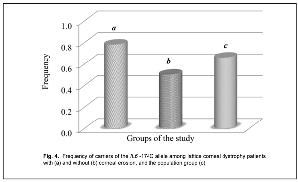 Among the group of patients with corneal erosions, we found 9 individuals (0.18) who were homozygous for the –174C allele that had been shown to be associated with a decreased production of IL6. The heterozygous -174GC genotype was a major genotype (0.600) both in the group and the population sample under study. A deviation from Hardy–Weinberg equilibrium, evaluated by comparing observed and expected genotype frequencies with an exact goodness of fit test, was observed in the patients with recurrent corneal erosion associated with LCD for this polymorphic variant (?2=4.08; р=0.04). Distribution of allele frequencies for the polymorphic variant was characterized based on the distribution of genotype frequencies among study patients and two control groups. The frequency of the carriers of the IL6 -174C allele was 0.780 in the corneal erosion group compared to 0.659 in the control population sample (p < 0.05) (Fig. 4) and 0.500 in the no-erosion control group; the difference for the latter group, however, did not reach statistical significance (p > 0.05), likely due to small group size.