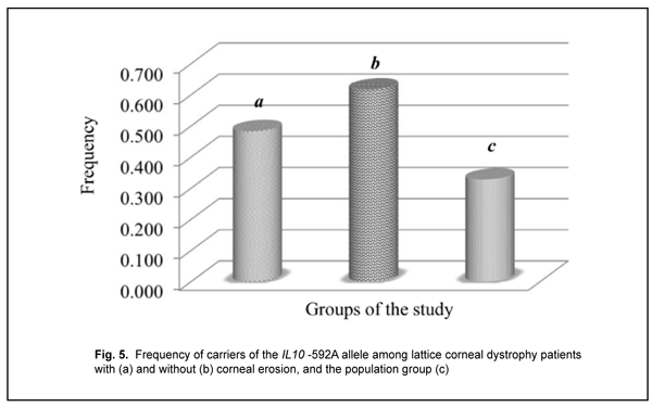 The distribution of genotypes for the polymorphic allele of IL10 -592 С/A among the study group and control group was determined based on the results of molecular genetic studies. The homozygous wild-type (-592 СС) genotype was the most common (0.518) for patients with recurrent corneal erosion and population sample, whereas the heterozygous (-592 СA) genotype was the most common (0.462) for patients without corneal erosions. No deviation from Hardy–Weinberg equilibrium, evaluated by comparing observed and expected genotype frequencies with an exact goodness of fit test, was observed in the patients with recurrent corneal erosion associated with LCD for this polymorphic variant (?2=0.49; р=0.380). There was a statistically significant difference (p < 0.05) in the proportion of carriers of the IL10 -592A allele between patients with recurrent corneal erosion (0.483) and population sample (0.327) (Fig. 5).