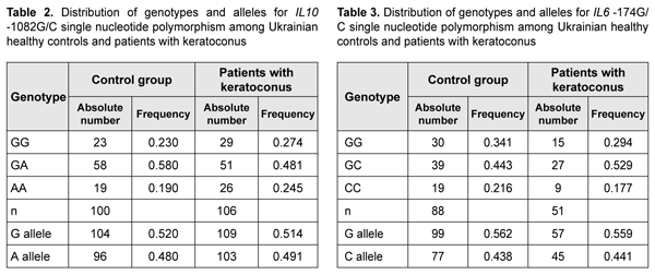 Introduction The disorders associated with pathological changes in the cornea are a challenge for the ophthalmologist, because they substantially affect visual acuity and may lead to visual disability. Keratoconus (or corneal ectasia) is one of the most common corneal disorders with an average annual incidence rate of 2.0 per 100,000 population [1], and prevalence ranging from 50 to 230 cases per 100,00 population, with a wide variation in prevalence across ethnic populations. Keratoconus is recognized as a multifactorial disease with a genetic component, and a number of candidate genes have been linked to the disease. Lattice corneal stromal dystrophy (LCD), a monogenic disorder with varying phenotypic manifestations, is another important issue and the most common hereditary corneal dystrophy in Ukraine, with as much as about 40.2% of hereditary corneal dystrophy cases attributed to this disease. Keratoconus (KC) is an idiopathic, progressive, non-inflammatory corneal dystrophy that is commonly chronic. It is a condition in which the cornea assumes a conical shape because of thinning and protrusion. This results in longitudinal increases in corneal curvature and changes in corneal optical characteristics, leading to incorrect central and paracentral astigmatism with significantly decreased vision. There is accumulating evidence supporting a genetic basis of keratoconus, while an environmental factor may be essential to act as a trigger in genetically predisposed individuals. The bilaterality of the disease strongly supports a genetic basis. In addition, the disease is frequently associated with hereditary disorders or syndromes (Down’s syndrome, Marfan's syndrome, Leber’s blindness, optic nerve atrophy, retinal pigment degeneration, cataract, Crouzon's syndrome, blue sclera, incomplete osteogenesis, type IV Ehlers-Danlos' syndrome, mitral valve prolapse, etc) [2-5]. In addition, a genetic predisposition to keratoconus is well documented with increased incidence in some familial groups [6, 7] and numerous reports of concordance between monozygotic twins [8-11]. It is noteworthy that positive family history has been documented in 6% to 23% KC subjects [12, 13]. First degree family members are at higher risk of keratoconus than normal population [14]. A number of candidate genes have been linked to KC. There is a number of heritable and frequently associated with each other quantitative traits among biometric parameters of the human eye. One of them is central corneal thickness (CСT), with its heritability being as high as 0.95 [15]. Extreme CCT measurements have been associated with rare hereditary connective tissue disorders such as brittle cornea syndrome (BCS) and several types of osteogenesis imperfect [16,17], whereas moderate CCT measurements have been associated with more common eye disorders in elderly individuals. CСT is believed to be an essential trait in keratoconus [18,19]. Previous genome-wide association studies (GWAS) have identified eleven loci associated with ССT in European and Asian populations [20,21,22,23]. Association of KC with certain gene polymorphisms, such as those of hepatocyte growth factor (HGF), has been demonstrated [24]. Although KC is defined as a non-inflammatory corneal dystrophy, recent studies have shown that cytokines, proteolytic enzymes and free radicals play a role in the development of the disease [25]. Elevated tear IL6, TNF-? and ММР-9 levels have been demonstrated in patients with KC. In addition, eye rubbing contributes to increased tear IL6, TNF-? and ММР-9 levels, and is a risk factor for KC [26-31]. Interleukin-10 (IL10) is an anti-inflammatory cytokine, and the IL10 gene is highly expressed in injured corneal epithelium. Mouse models have demonstrated that IL10 -1082 G/A (rs1800896) substantially effects the level and functional activity of the encoded protein. The recognition site for the transcription factor C/EBP disappears in the presence of the A allele in IL10 rs1800896. Findings of experimental studies have confirmed that such a substitution will be associated with reduced expression of the gene and production of the relevant protein [32, 33]. Given that anti-inflammatory cytokines play a crucial role in eliminating inflammatory cells and protecting against corneal ulcers and neovascularization, we have chosen IL10 rs1800896 as a candidate gene for a genetic predisposition to keratoconus. There have been numerous studies on the effect of cytokines on corneal epithelial repair after mechanical or chemical injury [34,35,36]. The corneal epithelial wound healing response is brought about by a complex cascade of events involving cytokine-mediated interactions between the epithelial cells, keratocytes of the corneal stroma, corneal nerves, lacrimal glands, and cells of the immune system [34]. Thus, pro-inflammatory cytokines IL1, IL6 and IL8 regulate proliferation and migration of corneal cells and degradation of collagen residue, and protect the site of injury from bacterial infection [34,37]. Two allelic variants in the IL6 promoter, -597G/A and -174 G/C, have been considered as risk factors for these disorders. These promoter polymorphisms regulating IL6 gene expression are associated with production of the relevant protein and circulating levels of C-reactive protein [38]. Based on the results of the analysis of a regulatory sequence associated with IL6 gene, we chose a single-nucleotide guanine-to-cytosine substitution at position ?174 of the IL6 gene promoter as a subject for further analysis. Based on the results of analysis of the predicted effect of this polymorphism on the structure of transcription factor recognition sites, we found that the single-nucleotide substitution is located in the recognition site of NRD and may result in disappearance of the cis- regulatory site in the promoter region. In an in vitro study [39], the -174C construct showed lower expression than the -174G construct. In addition, it has 