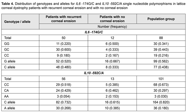 To elucidate the possible role of IL6 -174G/С and IL10 -592С/A (the latter SNP is non-equilibrium linked with IL10 -1082G/C that we have already investigated) as phenotype modifiers in patients with LCD, we conducted molecular genetic studies of these variants in patients with recurrent corneal erosions. Table 4 presents the distribution of genotypes among groups.