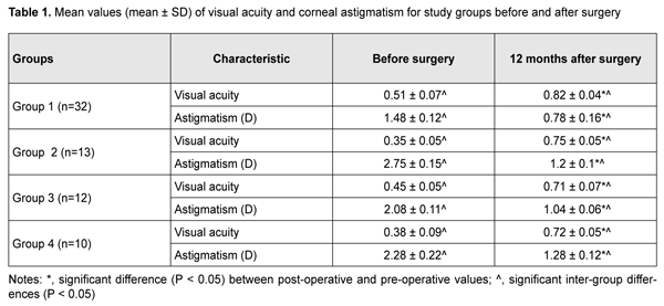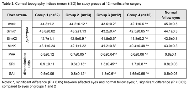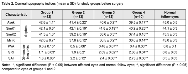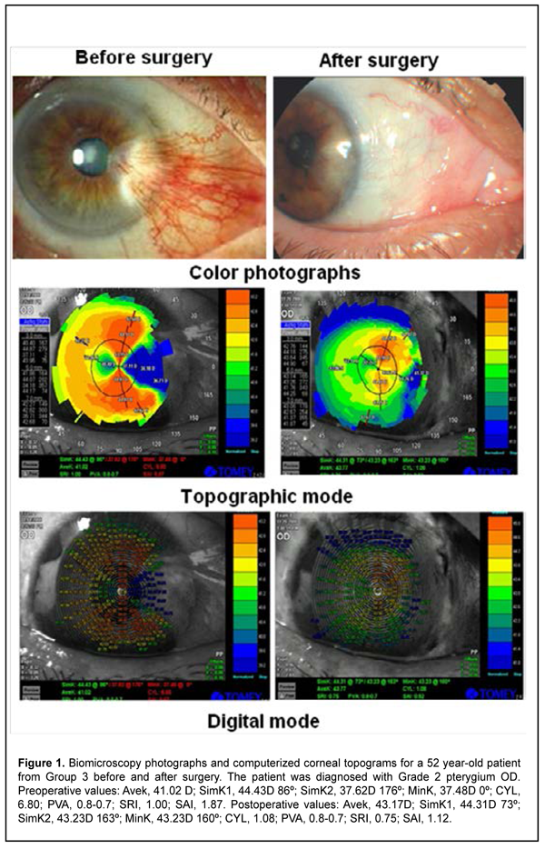 Introduction The term “persistently recurring pterygium” was coined by Iakimenko [1] and Legeza and collegues [2]. A pterygium is an ophthalmoheliosis characterized by a wing-shaped proliferation of the vascularized conjunctiva that encroaches onto the cornea [3-5]. It represents a proliferative, degenerative and inflammatory disease developing due to pathological hyperplasia and vascularization of the epithelium and migration of abnormal limbal stem cells to the central cornea, and accompanied by profound changes in the structure of underlying tissue, including destruction of the Bowman membrane [6-10]. Visual acuity drops sharply due to growth of wing-shaped conjunctiva onto the cornea, resulting in incapacity for work, professional impropriety, and, consequently, disability, in individuals of the working age [4, 11]. The corneal changes developing in the course of pterygium and after pterygiumectomy are rather difficult to analyze using conventional diagnostic techniques. Corneal topography is a promising modality, and enables an assessment of some objective and quantitative parameters of the cornea [12, 13]. The purpose of the study was to assess the influence of persistently recurring pterygium on the optical interface of the cornea using refractometry and corneal topography. Material and Methods Sixty patients (67 eyes) with persistently recurring pterygium who were treated at the Eye Disease Department of Multifield Clinic of Tashkent Medical Academy during 2013 to 2019 were included in this study. Of these, 46 (76.7%) and 14 (23.3%) lived in rural and urban areas, respectively. Patient age varied from 20 years to 65 years, and most of patients were from the age groups of 31-50 years (41.7%) and 51-65 years, that is, working-age and socially active groups of the population. Disease duration was < 2 years in two patients, 2 to 5 years in 18 (30%) and > 5 years in 36 (60%) patients. Each patient had had a history of pterygium surgery and at least one pterygium re-surgery, but patients varied in pterygiumectomy they had had received. Patients were divided in four groups based on the number of recurrences: Group 1 included 32 (47.7%) eyes with one recurrence, Group 2, 13 (19.4%) eyes with two recurrences, Group 3, 12 (17.9%) eyes with three recurrences, and Group 4, 10 (14.9%) eyes with four recurrences. Biomicroscopy studies found that there was a difference in clinical manifestations between eyes with persistently recurring pterygium and eyes with primary pterygium. In all cases, pterygium was seen along the limbus, corresponding to a sector of 1/2 to 1/3 of the circumference of the limbus. Inflammatory manifestations in the conjunctiva were more apparent and were revealed in 56 (83.5%) eyes. In these eyes, pterygium tissue was commonly scarred, dense, and immobile, and lost elasticity. Pterygium vessels were located atypically and were convoluted. The head of the pterygium was dense, had a chondroid consistency, and was fused with the cornea. Five (7.4%) eyes showed two to four pterygium heads, evidencing a severe course of the disease. In 51 (76.2%) eyes, infiltrates were present in the corneal tissue anterior to the head, and Fuchs islets were seen in the superficial layers. Twenty-four (35.8%) eyes demonstrated deformation of the semilunar fold due to cicatricial changes in the conjunctiva. The lacrimal caruncle was deformed, with a varying loss of outward mobility of the globe, in 9 (13.4%) eyes. Cicatricial strabismus was seen in 3 (4.5%) eyes. Six (8.9%) eyes exhibited short fornices, and 3 (4.4%) eyes, marked symblepharon. In addition, 14 (20.8%) eyes showed mild corneal scars due to history of pterygium surgery. All patients underwent combination pterygium excision with conjunctival autografting modified by us [14] for persistently recurring pterygium. Visual acuity assessment, refractometry with auto ref/ keratometer HRK-9000A (Huvitz, South Korea) and computerized corneal topography with computerized videokeratograph TMS-2N (Tomey Corporation 2-11-33; 451-0081, Japan) were used to assess the optical interface of the cornea. Studies were performed before and 3, 6 and 12 months after surgery. Corneal topograms were presented in three major formats (topographic, digital and 3D formats). Klyce corneal statistics software was used. Klyce corneal statistics involves Corneal Statistics Tables with Simulated Keratometry Readings (SimK), Surface Asymmetry Index (SAI), Surface Regularity Index (SRI) – Potential Visual Acuity (PVA), and Average Keratometry (Avek) indices [15]. Results Records of patients who exhibited no recurrence within 12 months after surgery were included in the analysis. Indices (including, in particular, visual acuity and corneal astigmatism) taken before surgery and 12 months after surgery were assessed. Table 1 presents values of uncorrected visual acuity (UCVA) and corneal astigmatism for patients of the four study groups. In patients of Group 1, mean UCVA significantly increased from 0.51 ± 0.07 at baseline to 0.82±0.04 at 12 months after re-surgery, and mean corneal astigmatism significantly decreased from 1.48 ± 0.12 D at baseline to 0.78 ± 0.16 D at 12 months after re-surgery. Compared to patients of Group 1, patients of Group 2 (with a history of two recurrences) had significantly decreased mean UCVA (0.35 ± 0.05) and significantly increased mean corneal astigmatism (2.75 ± 0.15 D) values before surgery. After surgery, mean UCVA and mean corneal astigmatism in patients of Group 2 improved to 0.75 ± 0.05 and 1.2 ± 0.1 D, respectively; these values, however, were subnormal. There were significant differences between postoperative and preoperative UCVA and corneal astigmatism for patients of Group 2 (Table 1). There was a similar tendency regarding mean UCVA and mean corneal astigmatism in patients of Groups 3 and 4. Thus, in patients of Group 3, mean UCVA increased from 0.45 ± 0.05 at baseline to 0.71±0.07 at 12 months after re-surgery, a