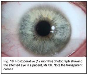 At 12 months after surgery, the cornea was transparent and epithelized (Fig. 10). UCVA was 1.0 OU.