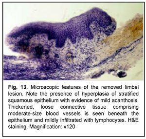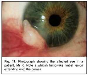 Case 3 A male patient of 52 years presented to us with a 4-month history of a gradually increasing white lesion in his right eye. He complained of redness, itching and foreign body sensation in this eye. In addition, he had a history of pterygium surgery in his right eye 7 months before. At presentation, UCVA was 0.6 OD and 1.0 OS. Biomicroscopy of the right eye revealed a white lesion at the limbus between 7 and 8 o’clock. The rest of the cornea was transparent. The anterior chamber was of moderate depth and the pupil was mobile (Fig. 11).