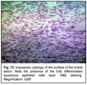 Clinically, a recurrent lesion was suspected to be dermoid or fibroma. Impression cytology showed a well differentiated epithelial tissue pattern (Fig. 12).