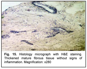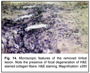 A B-scan ultrasound image of the right eye showed moderately echogenic substrate measuring 2.5-mm thickness and 8.4 х 7.2-mm lengths at the limbus from 7 to 9 o’clock. The corneal thickness beneath the substrate was 0.25-0.35 mm. On January 19, 2017, the patient underwent removal of the limbal and corneal lesion and subsequent keratoscleral plasty in the right eye. The removed tissue was sent for histological examination (Figs. 13-15).