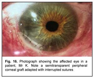 At the time of discharge: UCVA was 0.6 OD and 1.0 OS. On biomicroscopy of the right eye, the conjunctiva was pink; the corneoscleral graft in the external inferior quadrant of the cornea was transparent, adapted with interrupted sutures, and did not stain with fluorescein. The limbus was well vascularized. The rest of the cornea was transparent (Fig. 16).
