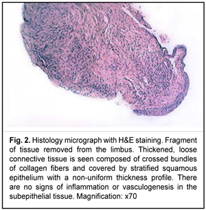 A sonogram of the right eye showed moderately echogenic substrate measuring 0.75-mm height and 2.7 x 2.5-mm length in the peripheral anterior corneal surface at the 3 o’clock with extension into the limbal conjunctiva. Anterior corneal contour beneath the substrate was slightly molded. No evidence of focal space-occupying pathology was revealed in the ciliary body. Impression cytology showed epithelial hyperplasia without cell atypia. On November 20, 2019, the patient underwent removal of the tumor-like lesion, and the amniotic membrane cryopreserved at 196°С was applied to cover the corneal defect. During the surgical procedure, the tumor-like mass was completely removed intracapsularly within the corneal epithelium. Amniotic membrane was applied as a peripheral transplant and sutured to the epithelial defect margin using interrupted 10-0 nylon sutures. A soft therapeutic contact lens was placed on the corneal surface. The removed tissue was sent for histological examination (Fig. 2).