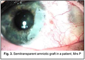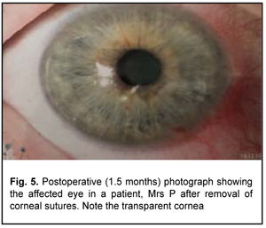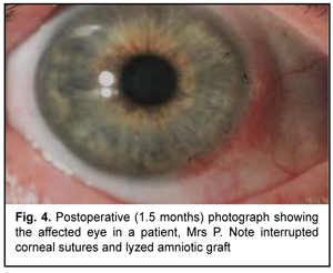 At 1.5 months after surgery, the amniotic graft appeared completely lysed, and the cornea was transparent, epithelized and did not stain with fluorescein (Figs. 4,5).