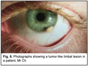 Case 2 A male patient of 21 years presented to the institute with complaints of a 4-month history of a lesion in his left eye. He reported no trauma of the head or the left eye. At presentation, UCVA was 1.0 OU. Biomicroscopy of the left eye revealed a yellowish lesion at the limbus at 5 o'clock position with associated corneal involvement. The rest of the cornea was transparent. The anterior chamber was of moderate depth and the pupil was mobile (Figs. 6).