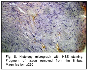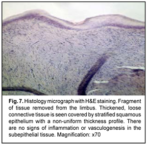 The clinical diagnosis was a limbal neoplasm with partial peripheral corneal involvement. The patient was suspected of having either dermoid, lipodermoid or lipoma. Impression cytology showed transitional and epidermal epithelial layers without cell atypia or polymorphism. This patter is characteristic of benign epithelial hyperplasia. On April 3, 2018, the patient underwent removal of the limbal and corneal lesion and subsequent keratoscleral plasty. The removed tissue was sent for histological examination (Figs. 7,8).