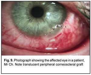 At the time of discharge: UCVA was 1.0 OD and 0.5 OS and the pin-hole visual acuity was 1.0 OS. On biomicroscopy of the left eye, the conjunctiva was pink. The lamellar graft was seen at the limbus at the 5 o’clock position and was transparent, adapted with interrupted sutures, and did not stain with fluorescein. The rest of the cornea was transparent. The anterior chamber was of moderate depth and the pupil was mobile (Fig. 9).