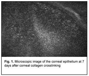 Introduction Keratoconus (KCN) is a corneal dystrophy that is characterized by structural changes in the cornea leading to progressive corneal thinning and bulging, which is accompanied by the development of irregular astigmatism and substantially decreased visual acuity [1-5]. Corneal collagen crosslinking (CXL) is generally regarded as the gold standard for treating progressive stage 2 to 3 keratoconus [6]. Photochemical ionization takes place and riboflavin is destroyed (with release of free oxygen) by exposure to UV-A radiation generated by the UV-X system. Free oxygen-derived radicals cause cross-linking between -СН and –CN groups in collagen molecules, which induces their binding to form a 3D meshwork. Numerous additional bounds between corneal collagen fibers result in a significant improvement of corneal mechanical strength and rigidity. Biomechanical studies have shown that corneal rigidity increases by 350%-380% after cross-linking [6-11]. Post-crosslinking biomicroscopic corneal changes in keratoconic eyes can be detected by confocal microscopy. Confocal corneal microscopy is an up-to-date technique enabling in vivo corneal monitoring with tissue cell and microstructural imaging. Clinical use of confocal corneal microscopy allowed moving to a new level of in vivo dynamic imaging of corneal ultrastructural changes of various etiology [12-15]. Quantitative composition of corneal cell layers is an important characteristic of the state of the cornea [16]. The list of corneal dystrophies and degenerations studied with confocal microscopy includes epithelial basement membrane dystrophies, Reis-Bucklers corneal dystrophy, Мeesmann corneal dystrophy, lattice corneal dystrophy, granular corneal dystrophy, spotted corneal dystrophy, Schnyder crystalline corneal dystrophy, posterior polymorphous corneal dystrophy, Fuchs’ endothelial corneal dystrophy (or cornea guttata), keratoconus, iridocorneal endothelial syndrome, Salzmann's corneal degeneration, retrocorneal membrane and primary corneal amyloidosis [15, 17-28]. Confocal microscopy allows for early disease diagnosis, differential diagnosis between various corneal disorders, and control of therapeutic and surgical treatment efficacy. Confocal microscopy studies have demonstrated substantial qualitative and quantitative changes in all corneal layers in keratoconic eyes. Thus, in vivo confocal microscopy (IVCM) allows for detecting morphological corneal changes as early as the subclinical stage of keratoconus [29]. Confocal microscopy studies by Hollingsworth et al [30] and Somodi et al [13] noted a substantially increased size of hyperreflecting epithelial cells and irregularly arranged superficial epithelial cells in keratoconic eyes. In addition, it has been demonstrated that desquamated epithelial cells are characteristic for keratoconic eyes. The central cornea of subjects with keratoconus and age-matched control subjects was assessed using IVCM and corneal aesthesiometry, and significant differences in corneal nerve fibre density were found between the former subjects and latter subjects [16, 31]. Keratoconic corneas exhibited abnormal sub-basal nerve architecture compared with patterns previously observed in normal corneas [32-34]. Keratoconus corneal stroma is always involved in the pathological process, with a decreased number of keratocytes that are irregularly arranged in the posterior stroma. As the disease progresses, microstriae appear as diverse hyporeflective thin lines [35]. Confocal miscroscopy found loss of the subbasal nerve plexus and a reduced number of anterior stromal keratocytes in early postoperative period (< 1 month) after treatment of progressive keratoconus by riboflavin-UVA-induced CXL. This may be observed clinically as temporary stromal corneal haze with edema. The regeneration of keratocytes starts at 3 months and is complete at 6 months after CXL [36, 37]. A few studies reported on morphological changes in the cornea after CXL performed with the Dresden protocol and after accelerated CXL (ACXL). Mazzotta et al [37] noted regeneration of the subbasal nerve plexus and restored keratocyte density at 12 months after CXL. The purpose of this study was to detect structural corneal changes after accelerated CXL for keratoconus. Material and Methods One hundred and nineteen patients (167 eyes; 90 men and 29 women) aged 12-57 years (25.3 ± 8.55 SD years; median value, 25 years) who underwent ACXL for keratoconus were included in this study. Of these eyes, 77 (46.1%) had stage II keratoconus, and 90 (53.9 %) had stage III keratoconus (Amsler-Krumeich classification). Accelerated CXL was carried out using the UV-X™ 2000 Crosslinking System (IROC Innocross, Zurich, Switzerland) at an irradiation intensity of 9mW/cm?. Patients underwent biomicroscopy, refractometry, and corneal confocal biomicroscopy (Confoscan 4, NIDEK Co., Ltd., Aichi, Japan) in addition to a routine eye examination. Pentacam® apparatus (Oculus Inc., Wetzlar, Germany) was used to perform keratography and corneal pachymetry and to estimate corneal refractive power. Kmax was used as a measure of corneal refractive power, and thinnest local corneal thickness was measured. Patients were followed up for 12 months after accelerated CXL procedure. Results The data below are arranged in the order of detected changes in corneal layers. In the early postoperative period, confocal corneal biomicroscopy findings included epitheliopathy (with an increased number of desquamated epithelial cells). In addition, on confocal biomicroscopy images, epithelial cell nuclei appeared brighter than the surrounding cytoplasm. Moreover, basal epithelial cells were polymorphic, and varied both in size and in brightness (Fig. 1).