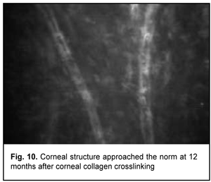 Background: Post-crosslinking (CXL) biomicroscopic changes in patients with keratoconus can be detected by confocal microscopy. Few studies reported on morphological changes in the cornea after CXL. Purpose: To detect structural corneal changes by confocal microscopy after accelerated CXL for keratoconus. Material and Methods: This study included 119 patients (167 eyes) who underwent accelerated CXL for keratoconus and were followed up for 12 months. Accelerated CXL was carried out using the UV-X™ 2000 Crosslinking System at an irradiation intensity of 9 mW/ cm?. Confocal biomicroscopy was performed using the Confoscan 4 unit (NIDEK Co., Ltd., Aichi, Japan). Results: Accelerated CXL (carried out in 10 minutes) for stage 2 to 3 progressive keratoconus is safe and allows stabilizing the pathological process, based on the 12-month follow-up results. At 3 months after accelerated CXL, active regeneration of keratocytes was seen in the superficial and deep stroma, with resolution of fibrotic foci. Confocal microscopy found that recovery of normal corneal architectonics started at 6 months and keratocyte repopulation was complete at 12 months after CXL. Keywords: keratoconus, corneal collagen, accelerated cross-linking