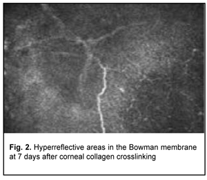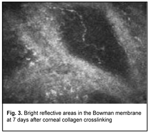 Confocal microscopy showed varying amounts of hyperreflectivity in the Bowman membrane, indicating active keratocyte regeneration. Transparency of the Bowman membrane was found to be restored at 1 month after accelerated CXL (Figs. 2, 3).