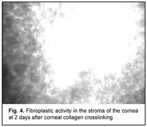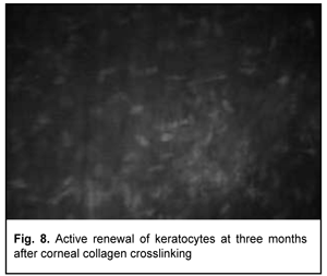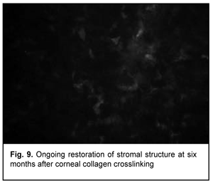 No changes in the posterior stromal layers and endothelium were found during the follow-up period. Evenly epithelized superficial cornea, transparent stroma and normal endothelium were seen on biomicroscopy. Compared to baseline, the clinical findings at 12 months were as follows: (1) mean astigmatism decreased from 4.16 ± 2.11(SD) D to 3.79 ± 2.56 (SD) D, (2) corneal refractive power as assessed by Kmax decreased significantly (р = 0.000) by 1.9 D to 55.9±6.93(SD) D (median value, 55.0 D); and (3) mean thinnest local corneal thickness did not change from baseline 453.7 ± 55.5(SD) ?m (median value, 455 ?m). In addition, ninety percent of patients self-reported improvements in both vision quality and tolerance of refractive correction with spectacles. Discussion Touboul and colleagues [38] compared early corneal healing following conventional, transepithelial, and accelerated CXL protocols. In vivo corneal confocal microscopy analysis of the postoperative impact of CXL on the cornea revealed clear differences among these protocols. Accelerated CXL had a greater impact than conventional CXL on the anterior cornea, with stromal changes including increased tissue reflectivity, complete obliteration of keratocytes, and a honeycomb appearance. Transepithelial CXL, however, did not appear to alter corneal morphology [38]. Mazzotta and colleagues [36-37] demonstrated that that despite a significant decrease in the mean density of anterior keratocytes in the first 6 postoperative months, cell density after CXL and ACXL returned to baseline values at 12 months. In addition, IVCM of the endothelium and limbal structures showed no evidence of pathological changes. Hyperreflective keratocytes in the anterior stroma indicate an active metabolic process and corneal stromal healing, and cause stromal haze that is seen on biomicroscopy. Temporary haze of the anterior-mid stroma after CXL represents an indirect sign of CXL-induced stromal collagen compaction and remodeling, and disappears 1 to 3 months after CXL [36-37]. Touboul and co-authors [38] noted that the central corneal subbasal nerve plexus corresponding to the crosslinking region was not visualized on confocal microscopy after CXL. These findings were confirmed by others [13, 31, 39-40] and point to the appearance of corneal re-innervation at 6 months after CXL. In line with these studies, the present study found gradual regeneration of the subbasal nerve plexus during the follow-up period, although the plexus was not distinctly visualized at 6 months after CXL. Knappe and colleagues [41] noted that, early after CXL, the most prominent structural changes revealed by confocal microscopy were seen in the anterior-to-mid corneal stroma. Our research found a significant decrease in density of the anterior stroma after accelerated CXL, with gradual keratocyte repopulation starting at 6 months and a complete restoration of their population at 12 months after CXL; this was in line with findings of others [42-45]. This study found a significant difference neither in the number nor in the increase in size of corneal endothelial cells between baseline and 12 months after accelerated CXL time points, which was in agreement with previous studies [47-48]. Therefore, our accelerated CXL for stage 2 to 3 progressive keratoconus made it possible to stabilize the pathological process in 100% of cases, based on the 12-month follow-up results. Keratoconus stabilization was accompanied by: a decrease of astigmatism to 3.79 ± 2.56(SD) D and of the corneal refractive power by 1.9D; an increase of the corneal thickness by 8.8 nm; and recovery of corneal thickness to baseline values (453.7 ± 55.5(SD) ?m). In addition, confocal microscopy found that recovery of normal corneal architectonics started at 6 months and was complete at 12 months after CXL. Conclusion First, accelerated CXL (carried out in 10 minutes) for stage 2 to 3 progressive keratoconus is safe and allows stabilizing the pathological process, based on the 12-month follow-up results. Second, confocal microscopy found that recovery of normal corneal architectonics started at 6 months and keratocyte repopulation was complete at 12 months after CXL.