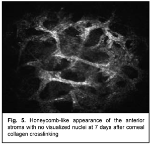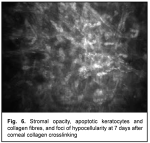 At day 2 after accelerated CXL, there were bright flares in collagen crosslinking region corresponding to the area of stromal fibroblastic metaplasia (Fig. 4). At day 7 after accelerated CXL, apoptotic keratocytes appeared in the anterior stromal layers in a honeycomb pattern, indicating the presence of a lacunar edema around them (Figs. 5, 6), but keretocyte nuclei were not visualized.