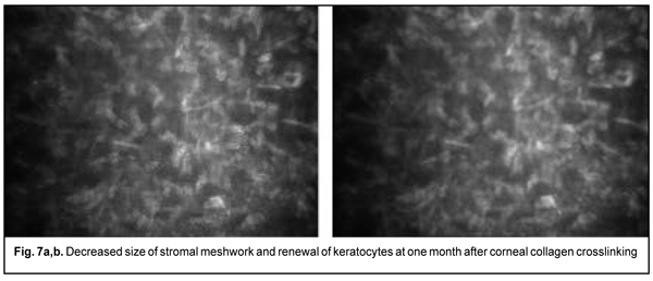 Of the 167 eyes, 9 (5.4%) had temporary complications in the form of corneal haze (superficial corneal stromal clouding) in the postoperative period. The haze disappeared and corneal transparency restored at day 6 or 7 after accelerated CXL. At 1 month after accelerated CXL, the epitheliopathy findings disappeared, epithelial cells were seen with distinct margins, and decreased cell polymorphism. A lacunar stromal edema around keratocytes decreased, which was reflected by a decrease in meshwork size (Fig. 7 a,b). The stroma became more homogenous, active kerastocytes appeared, but there were still foci of hypocellularity and isolated Langerhans cells were seen.