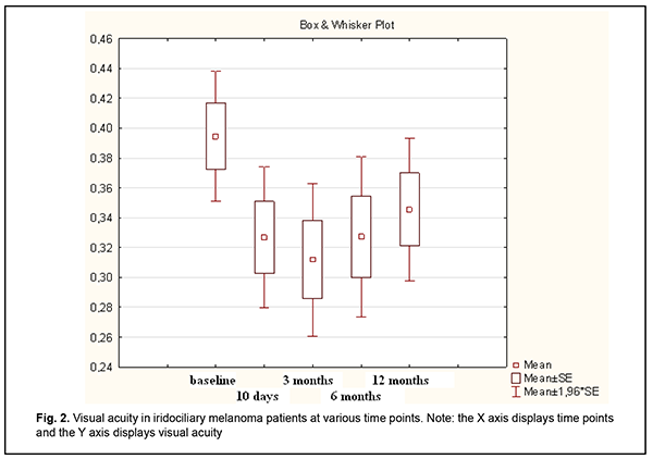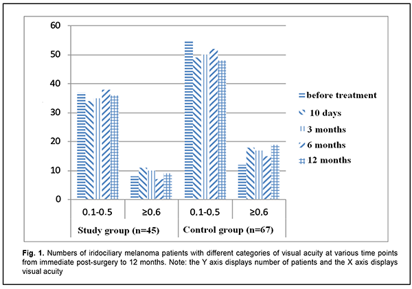 Introduction Uveal melanoma is a highly malignant tumor of the eye with a global annual incidence of more than 7,000 cases, and mean age-adjusted incidence of 4.3 per million [1, 2]. There is a nearly equal distribution of primary uveal melanoma by gender [2]. Caucasians and Hispanic Americans represent 98% and 1%, respectively, of cases in the US, and the rest (<1%) is attributed to American Asians, Africans and Native Americans. The disease is most commonly diagnosed in individuals aged 50-60 years (mean age, 55 years) [1, 2]. The age-adjusted incidence increases with increasing age until about age 70-75, then plateaus [1]. Approximately 90% of uveal melanomas arise in the choroid, 6% in the ciliary body, and the remaining 4% in the iris [2]. Therapy for uveal melanoma depends on the site and size of the tumor, course of the disease, fellow eye status, and patient’s systemic status. In addition, the therapeutic approach is tailored to the needs of the individual. Management options include transpupillary thermotherapy, brachytherapy, stereotactic radiotherapy, limited surgical resection, enucleation and orbital exenteration [3]. Surgical removal of pre-equatorial tumors may be associated with peri-operative complications (like expulsive hemorrhage, partial vitreous hemorrhage, and retinal detachment) and post-operative complications (cataract, ocular subatrophy, etc.) [3, 4]. On the basis of analysis of complications in surgical removal of pre-equatorial tumors, we concluded that they are caused by the surgical technique itself. First, tumor resection using cutting tools may be associated with hemorrhage which is difficult to control. Second, combining tumor removal with simultaneous local brachytherapy increases a therapeutic load on the eye, leading to ocular hypotony and subsequently to ocular subatrophy [4]. Given the above, it appears that the rate of these complications may be reduced if tumor resection is combined with simultaneous vessel coagulation with a radiowave surgery unit [5]. This will allow not only reducing the traumatic effect on the eye but also meeting the principles of ablastics (prevention of intraoperative dissemination of tumor cells) and reducing the risk of intraoperative hemorrhage. While implementing the outlined technology for organ-preserving management of iridociliary melanoma, we encountered some issues for which we have failed to find appropriate solutions in the literature. In addition, the literature is scant on the use of RF surgery in uveal melanoma, and there is no data on appropriate modes for a RF surgery unit in manipulation of the sclera, iris, ciliary body and choroid. Findings of our previous experimental study [6] have demonstrated that this approach is promising for the treatment of uveal melanoma, and encouraged us for further research. The purpose of the study was to determine the efficacy of resecting iris and/or ciliary body melanoma with the use of a 3.8-4.0-Mhz radiowave surgery unit. Material and Methods This study was conducted at Department of Eye Cancer, the Filatov Institute, from 2005 through 2018. The study group involved 45 patients with iris and ciliary body melanoma; the mean age was 56.3 ± 2.2 years, with a slight female predominance (53.3%). Sixty-seven patients who had undergone iridociliary melanoma excision using a conventional technique with cutting tools were used as retrospective controls. There was no significant difference in age, male/female percentage, visual acuity, or intraocular pressure (IOP). The set of diagnostic procedures adhered to the clinical guidelines from the Ministry of Health Order “On Approval of Protocols for Provision of Medical Care to Patients with Eye Disease” [7]. The eye examination included visual acuity assessment measurement, perimetry, biomicroscopy and ophthalmoscopy. Tumor, nodus и metastasis (TNM) staging was according to the American Joint Committee on Cancer (AJCC) [3]. No metastases were seen at the time of enrollment. The mean tumor prominence at baseline was 4.0 ± 0.3 mm, with a mean base diameter of 8.3 ± 0.4 mm, corresponding to a tumor volume of 34.3 ± 0.7 mm3. Operation technique Eye speculum was placed in the eye after preoperative showering with chlorhexidine. The scleral conjunctival incision was made 2-4-mm (depending on exact tumor location) outside the limbus at the tumor site, and the scleral conjunctiva was separated. Scleral projection of the tumor was clarified based on the data obtained from near-infrared transillumination, and the sector of exact tumor location was marked. Scleral incision was performed in a layer-by-layer fashion. A 3.8-Mhz radiowave surgery unit (Surgitron, Ellman International) was used to remove the tumor with 2-3-mm normal adjacent tissue margins in patients of the study group. The unit was set to 35 W in the coagulation mode and to 70-90 W in the cut mode to perform vessel coagulation and tissue dissection, respectively. Interrupted sutures were used to close the scleral incision, the anterior chamber was washed with Ringer solution, and the conjunctiva was closed using uninterrupted silk suture. Patients received disinfectant eye drops, parabulbar antibiotic and steroid injections and aseptic dressing. Antibacterial and anti-inflammatory therapy was used postoperatively. Prospective follow-up duration was from 12 months to 13 years (median value, 3.5 years). All the patients of each group were divided into two subgroups based on baseline visual acuity. The study group involved subgroup 1A (n=37 patients; 82.2%) with a visual acuity of 0.1 to 0.5 and subgroup 1B (n=8 patients; 17.8%) with a visual acuity of 0.6 to 0.8. The retrospective control group involved subgroup 2A (n=55 patients; 82.1%) with a visual acuity of 0.1 to 0.5 and subgroup 2B (n=12 patients; 17.9%) with a visual acuity of 0.6 to 0.8. The analysis was performed by analysis of variance (ANOVA) using Statistica 13.0 (Dell Statsoft Inc., Austin, TX) [8]. The tumor