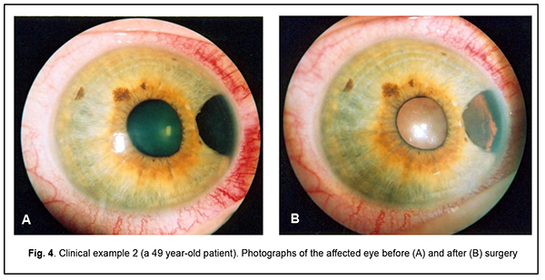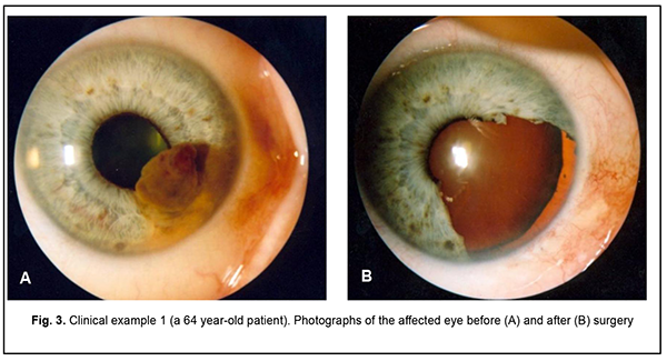 Clinical example 2 (patient Mr. M-r, 49 years old, medical record No. 352632) The diagnosis was an iridociliary melanoma OD, and the tumor was classified as a T1 N0 M0. Clinical description: OS: A pigmented iris lesion involving the ciliary body extended from 3 to 5 o’clock. The tumor base and thickness measured 3.5 х 4.0 mm and 2.1 mm, respectively, by ultrasonography. Preoperative visual acuity was 1.0 (Fig. 4a). The patient had iridocyclectomy with the use of a Surgitron radiowave unit. Histopathologic examination revealed a spindle A-B cell iris melanoma with involvement of the ciliary body. No complications were observed within the course of treatment. Postoperative visual visual acuity was 1.0 (Fig. 3b). No recurrence was observed during a follow-up of 6 years and 5 months.