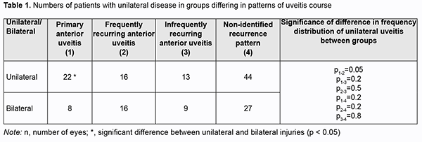 Most cases (73.3%) with primary uveitis had a unilateral disease (p = 0.05). A bilateral disease was more frequently found in patients with recurrent uveitis (42% to 50%) than in patients with primary uveitis (p > 0.05).