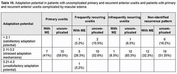 Each primary anterior uveitis patient showed stressed adaptation mechanisms with the adaptation potential within the range of 2.11 to 3.2 units (Table 10). Of the patients with recurrent anterior uveitis, 14% showed a satisfactory adaptation potential (less than 2.11 units), and 86%, stressed adaptation mechanisms. Anterior uveitis patients with ME tended to show a satisfactory adaptation potential more frequently than patients with uncomplicated anterior uveitis (Table 10). Therefore, of the anterior uveitis patients, the vast majority (84%) showed stressed adaptation mechanisms, and no one showed a severely damaged adaptation potential of the cardiovascular system’s response to the stimulus.