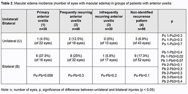 First, macular edema was found in 18.4% of cases with primary anterior uveitis, 20.8% of cases with frequently recurring anterior uveitis, and 3.3% of cases with infrequently recurring anterior uveitis.
